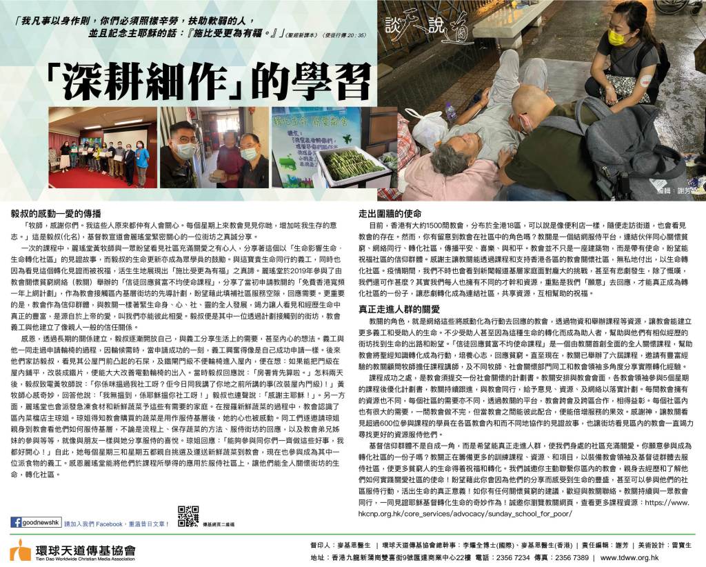 一次的課程中,麗瑤堂黃牧師與一眾盼望看見社區充滿關愛之有心人,分享著這個以「生命影響生命.生命轉化社區」的見證故事,而毅叔的生命更新亦成為眾學員的鼓勵。與這寶貴生命同行的義工,同時也因為看見這個轉化見證而被祝福,活生生地展現出「施比受更為有福」之真諦。麗瑤堂於2019年參與了由教會關懷貧窮網絡(教關)舉辦的「信徒回應貧富不均使命課程」,分享了當初申請教關的「免費香港寬頻一年上網計劃」,作為教會接觸區內基層街坊的先導計劃,盼望藉此填補社區服務空隙,回應需要。更重要的是,教會作為信仰群體,與教關一樣著緊生命身、心、社、靈的全人發展,竭力讓人看見和經歷生命中真正的豐富,是源自於上帝的愛,叫我們亦能彼此相愛。毅叔便是其中一位透過計劃接觸到的街坊,教會義工與他建立了像親人一般的信任關係。