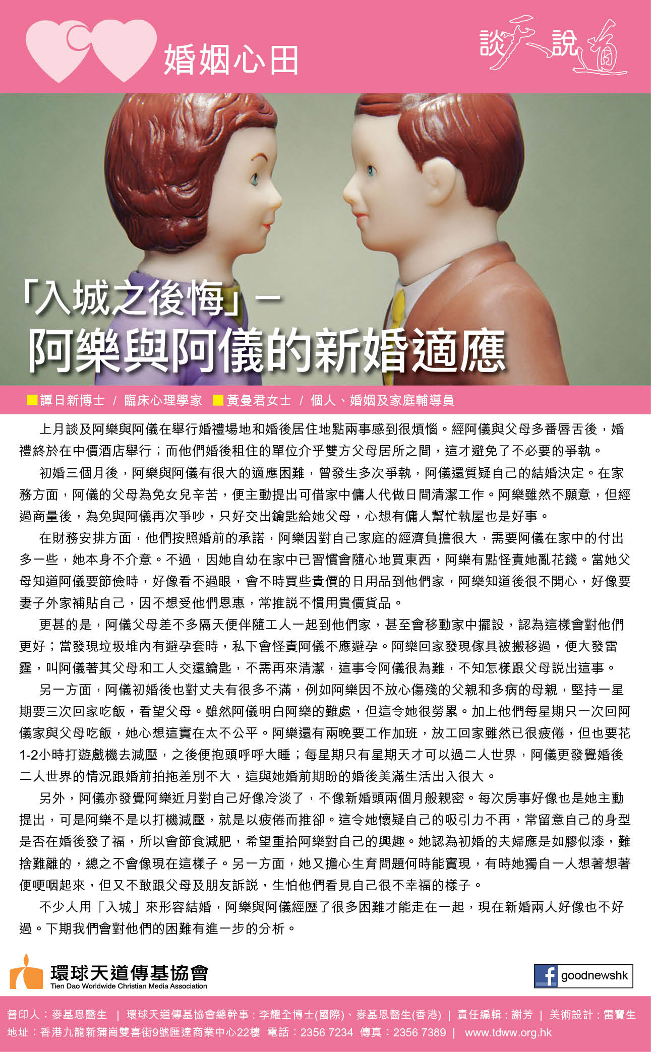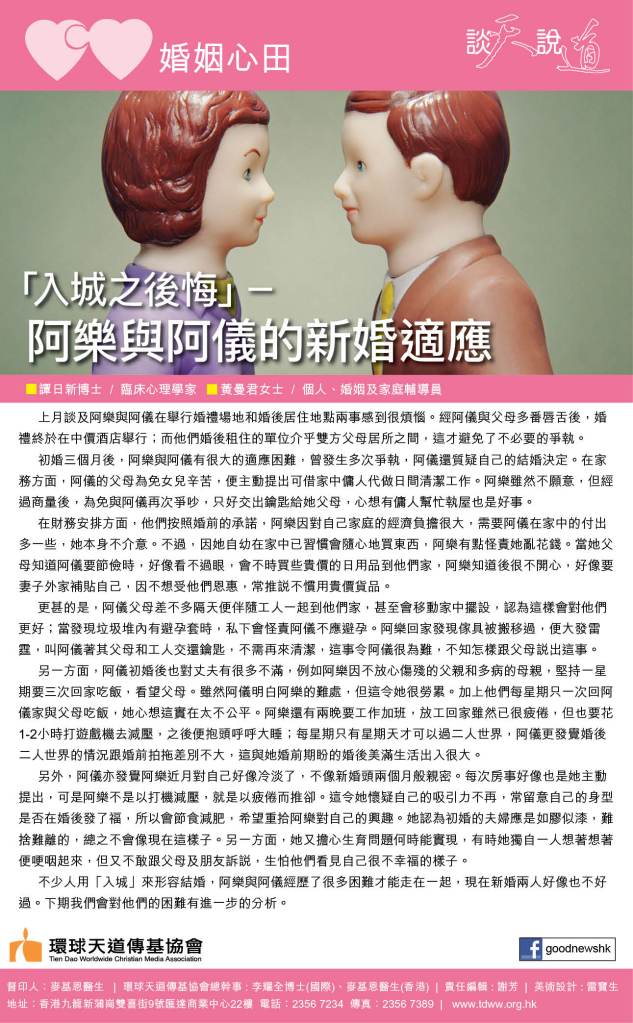 上期我們談及阿樂與阿儀在初婚三個月後,產生很多爭執,阿儀甚至有離異的念頭,原因可歸納如下﹕