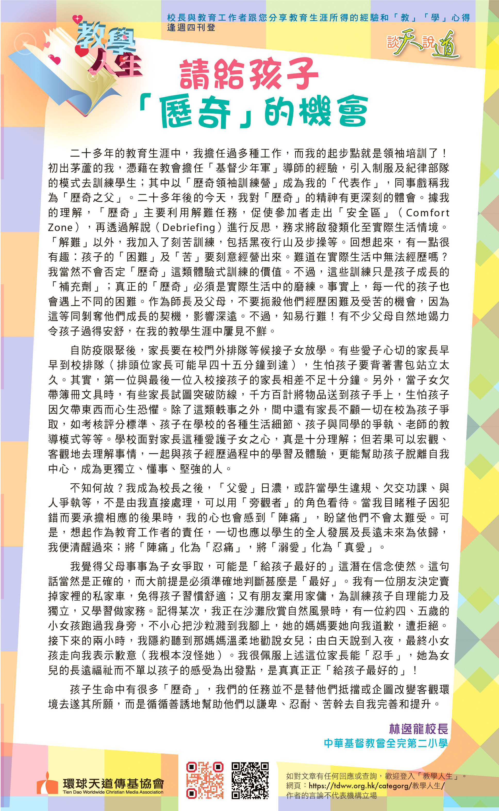 猶記得在他們五年級時,我以班主任的身分踏進「他們」的課室,猶如外人一般。我試過以各種方法與他們建立關係,都未見突破。對於這種不被接納,我起初「百思不得其解」,及後我得悉上一學年他們換了八次班主任後,才明白箇中因由;無怪乎一早已有同學問我何時離職。之後,我與他們逐一面談,以建立安全感,並落力推動班級經營。其中,以前文提及的粗豪男生的改變最明顯。從起初我搭著他的肩跟他説話,他把我推開;從每一次對話都是處理他的行為及人際問題,而他啟動了防禦機制;到後來他與我説話時自然靠近,流著淚向我細訴內心的掙扎,我就知道,我們的關係昇華了,我成為了他的同行者。在群體方面,他從一個發放負能量、憤世嫉俗的人,蛻變成為團結同儕的積極分子。最令人安慰是學校舉行班際歌舞比賽,他們雖然實力明顯不及另一班,但仍毅然報名參加。及後,那男生每天午膳後,召集眾人排練,而我則從旁支持、打氣!由於實力有限,士氣自會有起伏,我常以「我見過你成功,見過你失敗,但我未見過你放棄!」一句作勉勵。比賽完結了,他們如預期一樣獎項落空,但我卻以他們為榮。因為他們樂於尋求突破,擁抱希望,團結克己,這在人生跑道上的收穫遠比獎項寶貴。