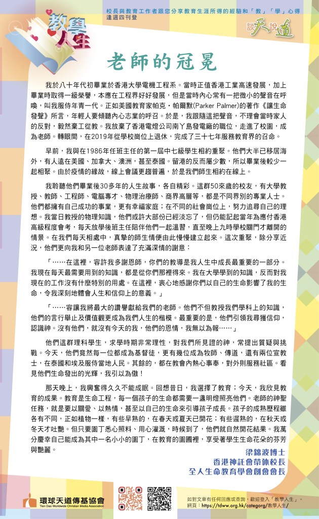 教育是以生命影響生命的事業,每位有特殊教育需要的孩子,皆有其獨特的潛質及能力,只要得到適當的啟發及照料,必能發揮所長。十分欣賞不少特殊教育工作者在疫情艱難期間,仍願意多走幾步,耐心引導、細心觀察、大膽嘗試、陪伴激勵、跨越困難,讓學生經歷成功,協助他們發揮更多姿采的人生。