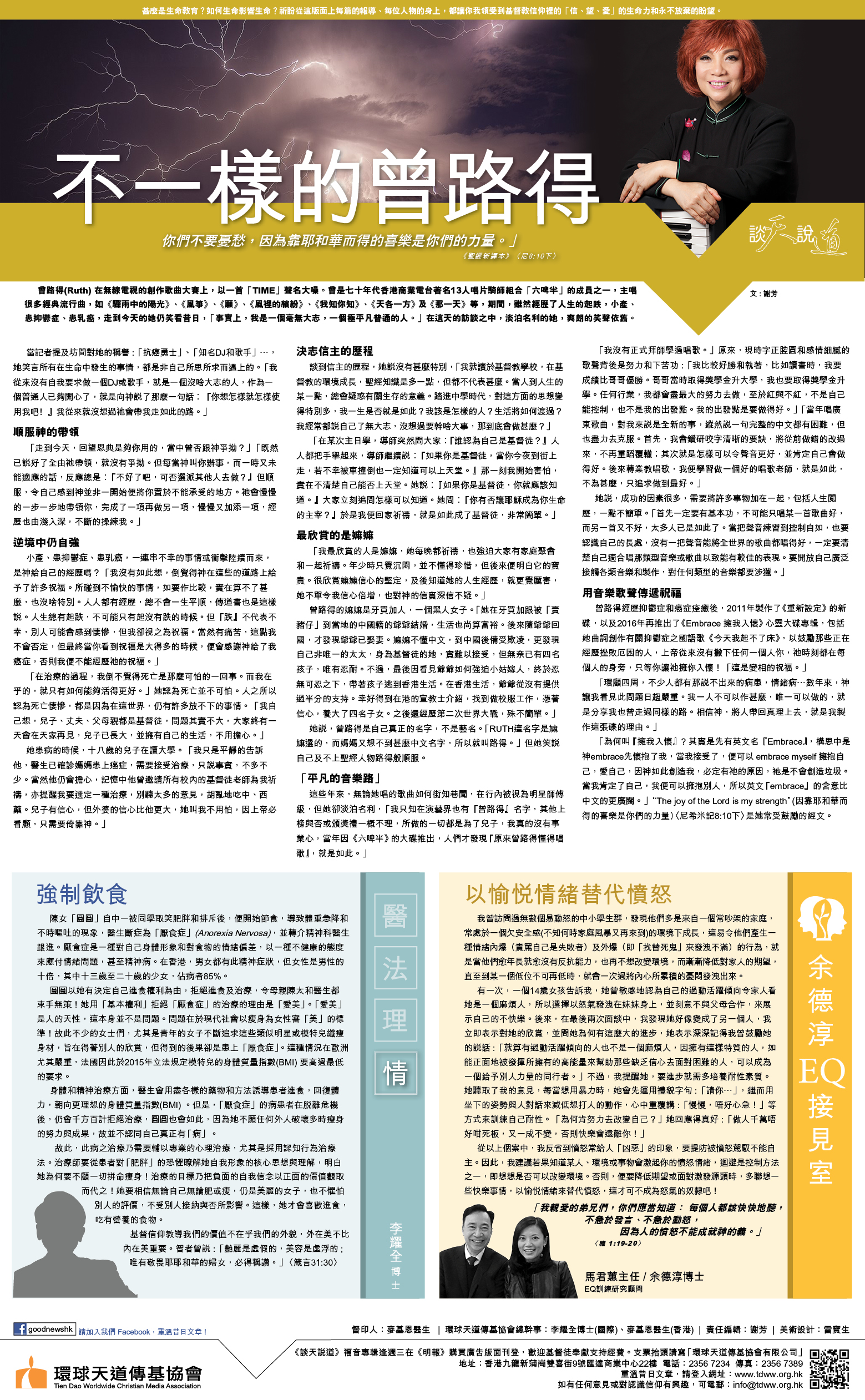 小產、患抑鬱症、患乳癌,一連串不幸的事情或衝擊陸續而來,是神給自己的經歷嗎?「我沒有如此想,倒覺得神在這些的道路上給予了許多祝福。所碰到不愉快的事情,如要作比較,實在算不了甚麼,也沒啥特別。人人都有經歷,總不會一生平順,傳道書也是這樣說。人生總有起跌,不可能只有起沒有跌的時候。但『跌』不代表不幸,別人可能會感到悽慘,但我卻視之為祝福。當然有痛苦,這點我不會否定,但最終當你看到祝福是大得多的時候,便會感謝神給了我癌症,否則我便不能經歷祂的祝福。」