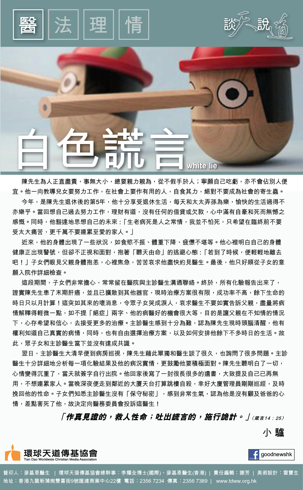這段期間,子女們非常擔心,常常留在醫院與主診醫生溝通聯絡。終於,所有化驗報告出來了,證實陳先生患了末期肝癌,並且已擴散到其他器官,現時治療方案很有限,成功率不高,餘下生命的時日只以月計算!這突如其來的壞消息,令眾子女哭成淚人,哀求醫生不要如實告訴父親,盡量將病情解釋得輕微一點,如不提「絕症」兩字、他的病醫好的機會很大等,目的是讓父親在不知情的情況下,心存希望和信心,去接受更多的治療。主診醫生感到十分為難,認為陳先生現時頭腦清醒,他有權利知道自己真實的病情,同時,也有自由選擇治療方案,以及如何安排他餘下不多時日的生活。故此,眾子女和主診醫生當下並沒有達成共識。