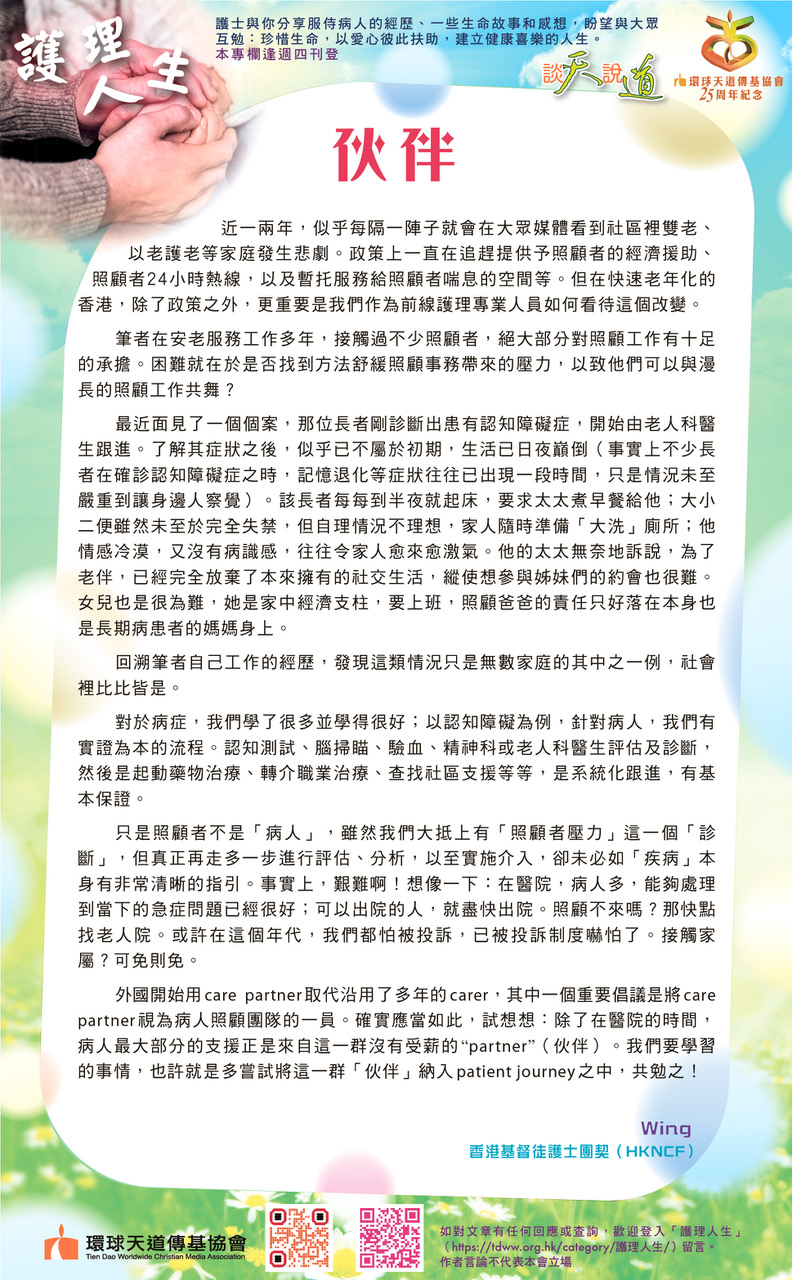 外國開始用care partner取代沿用了多年的carer,其中一個重要倡議是將care partner視為病人照顧團隊的一員。確實應當如此,試想想:除了在醫院的時間,病人最大部分的支援正是來自這一群沒有受薪的“partner”(伙伴)。我們要學習的事情,也許就是多嘗試將這一群「伙伴」納入patient journey之中,共勉之!