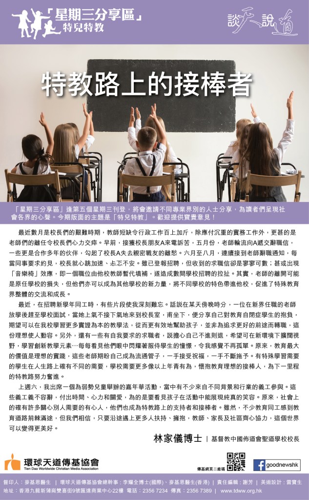 最近,在招聘新學年同工時,有些片段使我深刻難忘。話說在某天傍晚時分,一位在新界任職的老師放學後趕至學校面試,當她上氣不接下氣地來到校長室,甫坐下,便分享自己對教育自閉症學生的抱負,期望可以在我校學習更多實證為本的教學法,從而更有效地幫助孩子,並非為追求更好的前途而轉職,這份理想使人動容。另外,還有一些有自我要求的求職者,說擔心自己不進則退,希望可在新環境下擴闊視野,學習創新教學元素…每每看見他們眼中閃耀著服侍學生的憧憬,令我感覺不再孤單。原來,教育最大的價值是理想的實踐,這些老師期盼自己成為流通管子,一手接受祝福,一手不斷施予。有特殊學習需要的學生在人生路上確有不同的需要,學校需要更多像以上年青有為,懷抱教育理想的接棒人,為下一里程的特教路努力奮進。