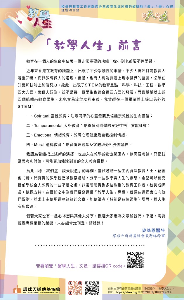 在此,我希望大家還有經常閱讀我們多年來在《明報》「談天說道」專欄的各篇文章。從今年一月開始,我們在《明報》從禮拜一至禮拜五的專欄,有四個全新欄目,包括:「婚姻靈性操練」、「婚姻心田」、「教學人生」、「理性與感性」。希望大家推介給親友,並歡迎給予改善意見。至於過去很受歡迎的專欄「醫學人生」和「癌症關懷」,將會在網上繼續不定時發表。