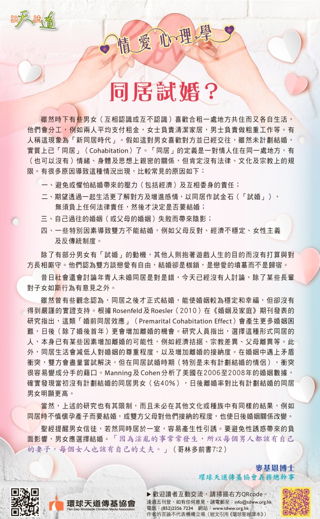 二、期望透過一起生活更了解對方及增進感情,以同居作試金石(「試婚」),無須負上任何法律責任,然後才決定是否要結婚;