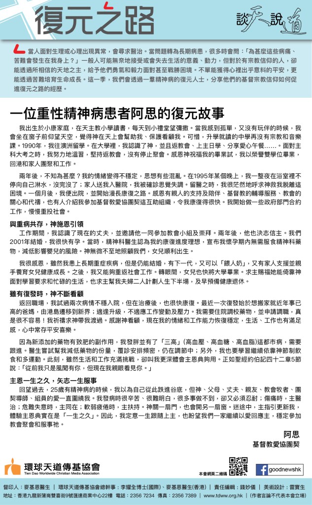兩年後,不知為甚麼?我的情緒變得不穩定,思想有些混亂。在1995年某個晚上,我一整夜在浴室裡不停向自己淋水,沒完沒了;家人送我入醫院,我被確診思覺失調。留醫之時,我很茫然地呼求神救我脱離這困境。一個月後,我便出院,並開始漫長康復之路。感恩有親人的支持及陪伴、基督教的輔導服務、教會的關心和代禱,也有人介紹我參加基督教愛協團契這互助組織,令我康復得很快。我開始做一些政府部門合約工作,慢慢重投社會。