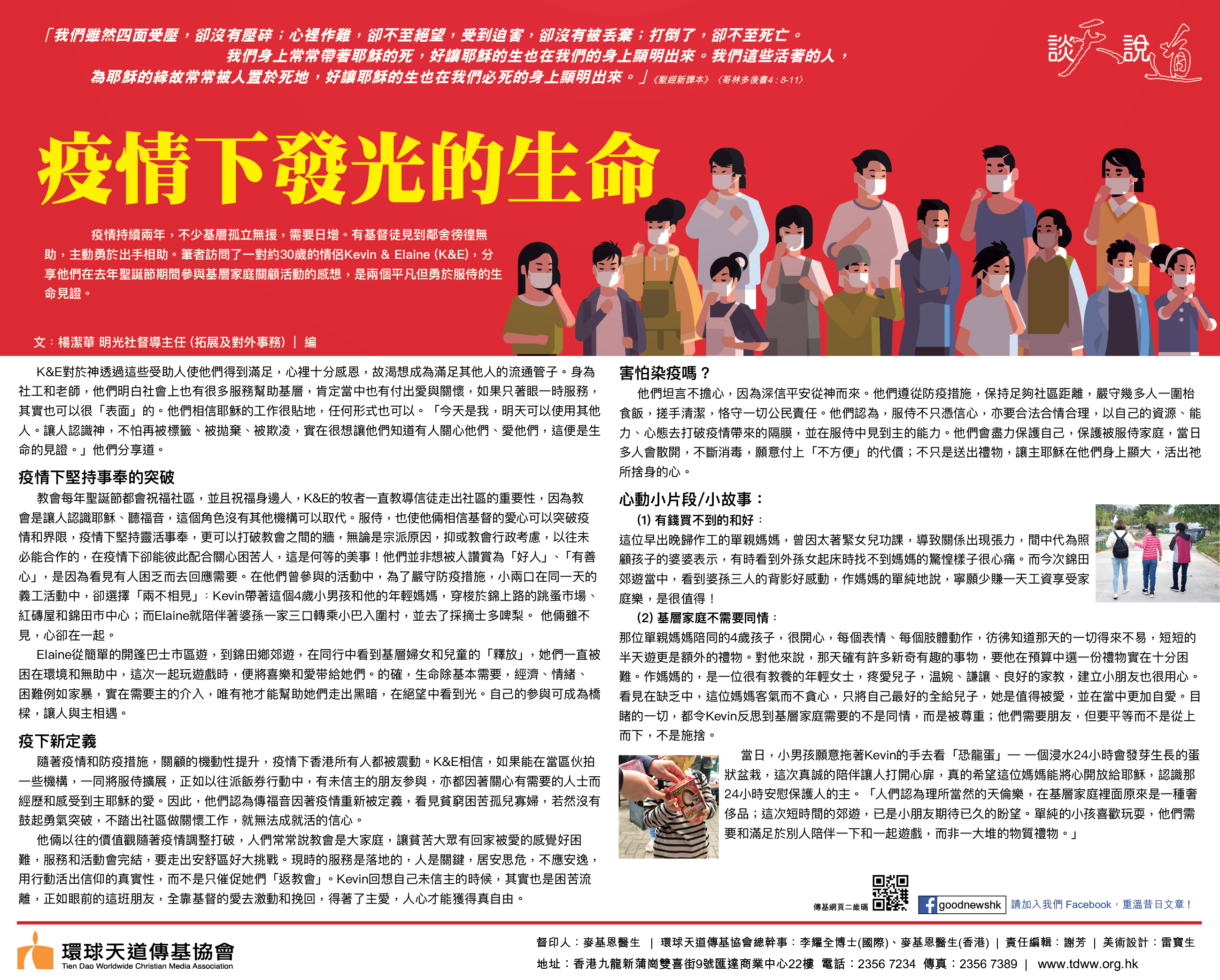教會每年聖誕節都會祝福社區,並且祝福身邊人,K&E的牧者一直教導信徒走出社區的重要性,因為教會是讓人認識耶穌、聽福音,這個角色沒有其他機構可以取代。服侍,也使他倆相信基督的愛心可以突破疫情和界限,疫情下堅持靈活事奉,更可以打破教會之間的牆,無論是宗派原因,抑或教會行政考慮,以往未必能合作的,在疫情下卻能彼此配合關心困苦人,這是何等的美事!他們並非想被人讚賞為「好人」、「有善心」,是因為看見有人困乏而去回應需要。在他們曾參與的活動中,為了嚴守防疫措施,小兩口在同一天的義工活動中,卻選擇「兩不相見」﹕Kevin帶著這個4歲小男孩和他的年輕媽媽,穿梭於錦上路的跳蚤市場、紅磚屋和錦田市中心;而Elaine就陪伴著婆孫一家三口轉乘小巴入圍村,並去了採摘士多啤梨。他倆雖不見,心卻在一起。