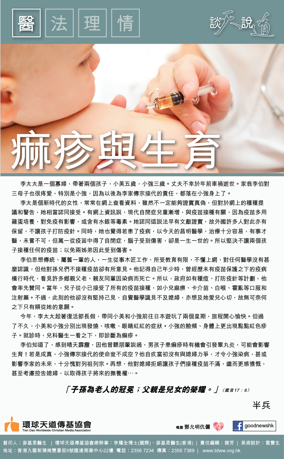 上期我們已指出,到目前為止,醫學研究仍未有足夠科學數據來證明痲疹疫苗會導致自閉症。相反地,痳疹是一種由過慮性病毒所感染的高度傳染疾病,若患者處理不善,會產生併發症,甚至死亡,因現時並沒有專治痲疹的藥物,所以預防是非常重要。關於健康的訊息,我們應嚴肅處理,小心作出判斷。根據香港衞生署推行的「香港兒童免疫接種計劃」,有關麻疹預防包括﹕一歲兒童會接種第一支的疫苗,到了六歲,便會接種第二支疫苗,但接種疫苗是屬自願性的。其實,醫學的理論不斷地演變更新,又不斷有新的突破,故此,在麻疹與生育之問題上,我們一般市民百姓應該尋求專家提供最新的專業意見,不要道聽途說。