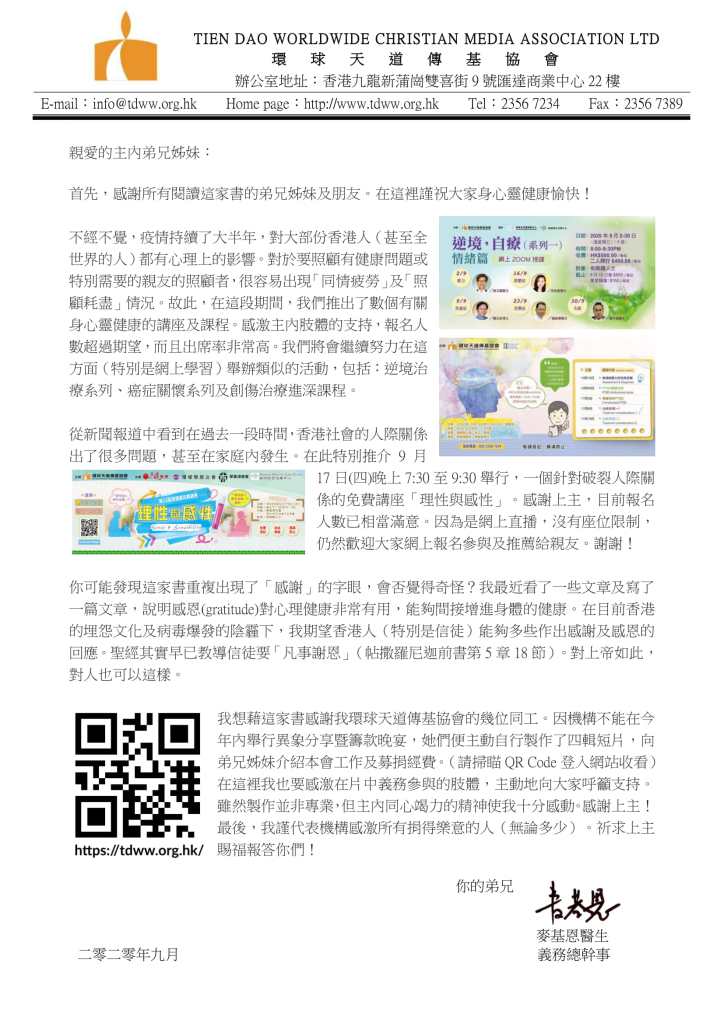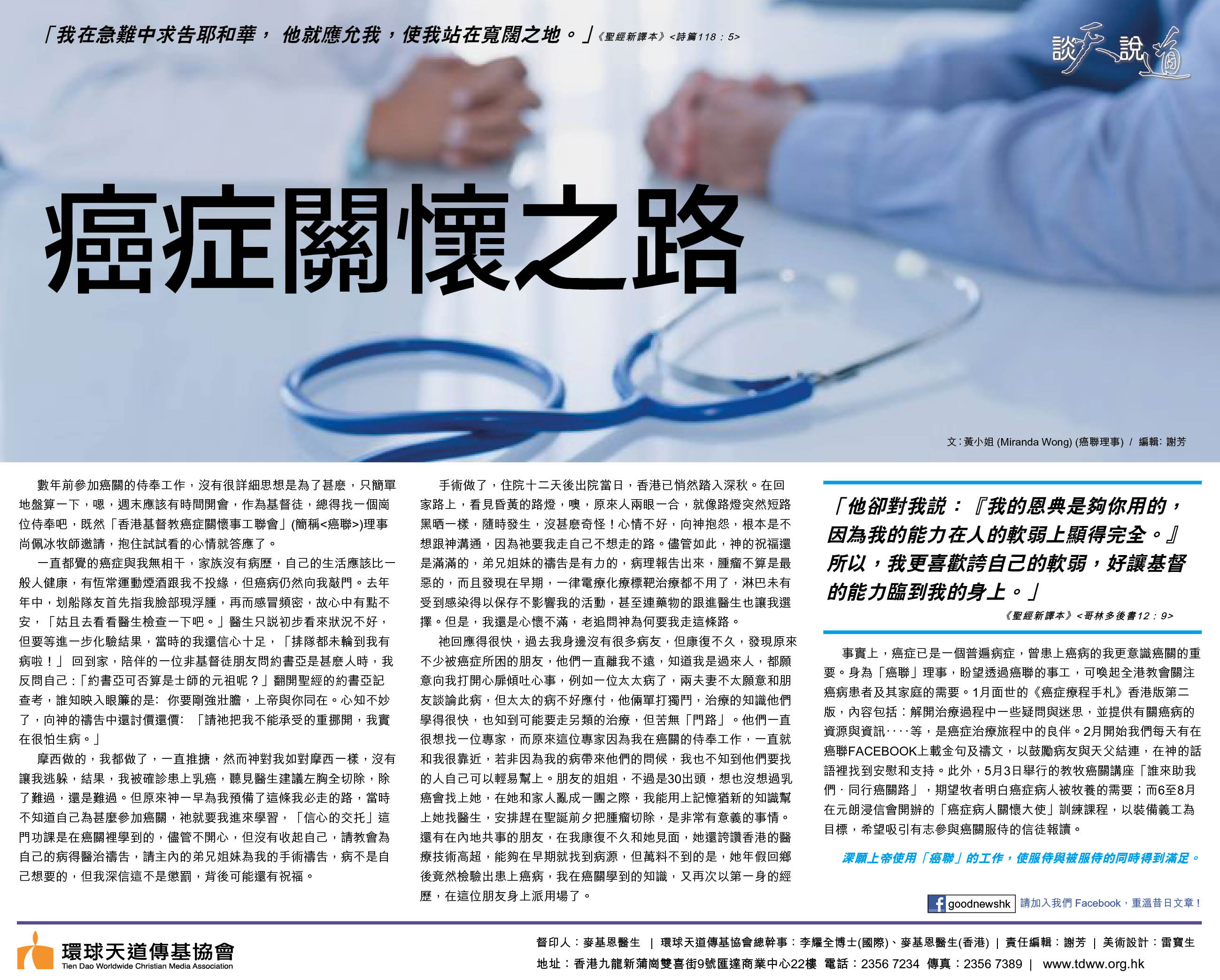 由於我曾患癌症,很了解癌症患者的憂慮與無助心態,因此可透過自己的經歷去幫助他們,讓他們得到治療相關的資訊外,更使他們感到關愛及了解!有同路人與他們面對困難從而卸下重擔,以及重拾信心面對治療挑戰!這樣,我們就能將天父的愛延續在癌患者身上。
