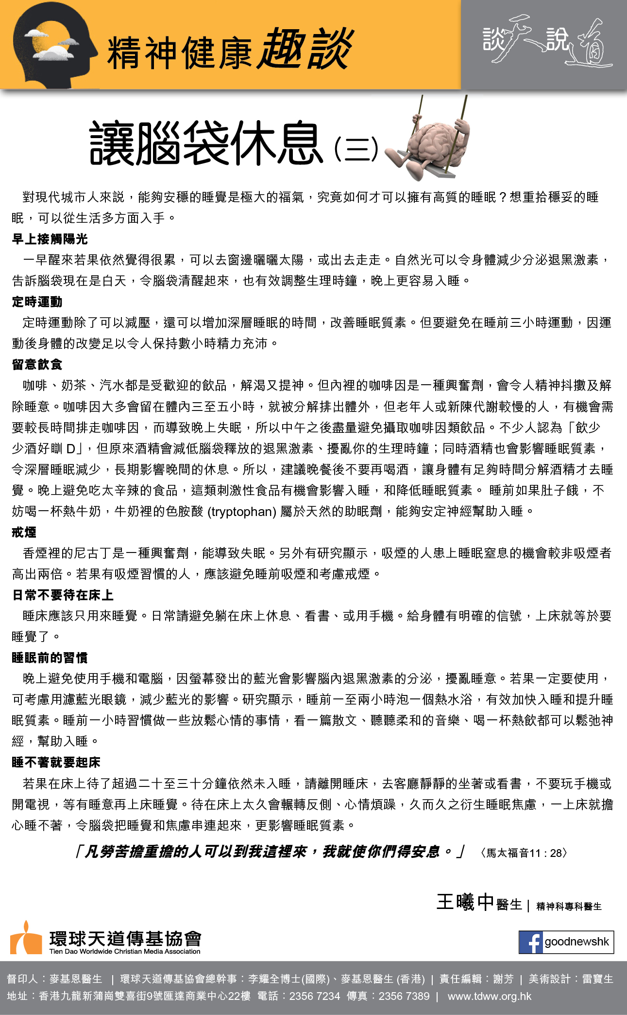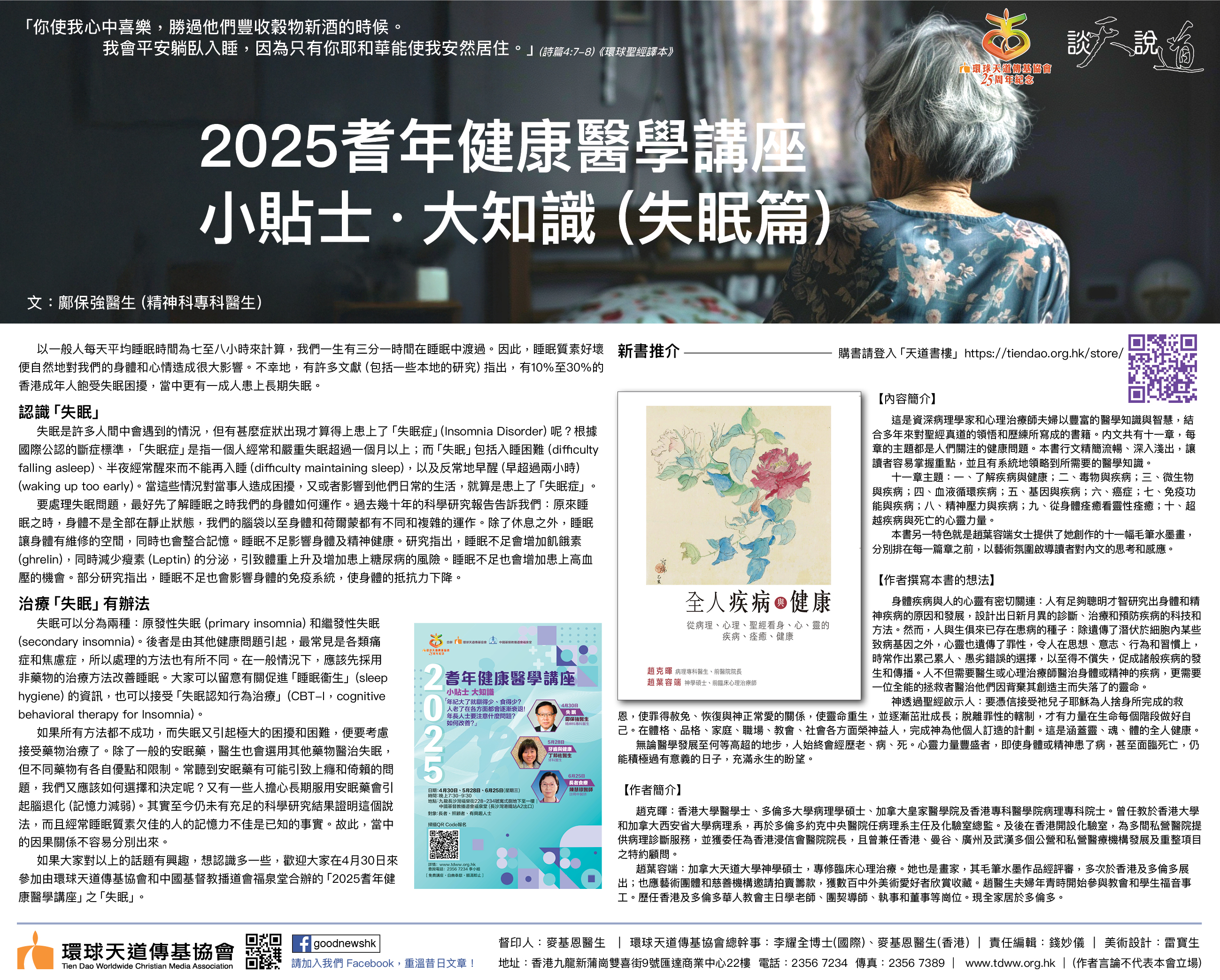 如果大家對以上的話題有興趣,想認識多一些,歡迎大家在4月30日來參加由環球天道傳基協會和中國基督教播道會福泉堂合辦的「2025耆年健康醫學講座」之「失眠」。