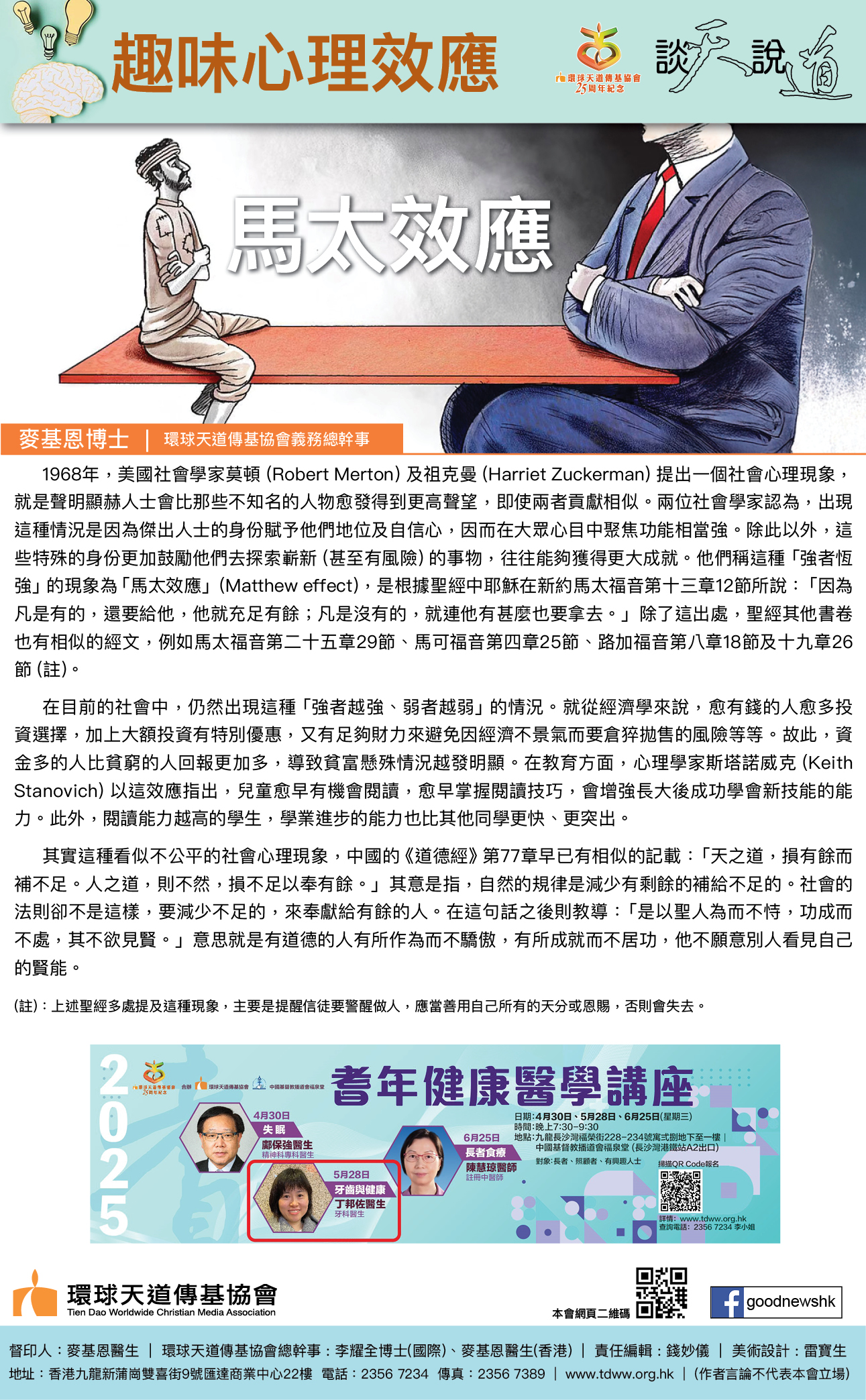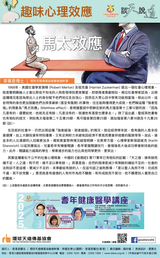 其實這種看似不公平的社會心理現象,中國的《道德經》第77章早已有相似的記載:「天之道,損有餘而補不足。人之道,則不然,損不足以奉有餘。」其意是指,自然的規律是減少有剩餘的補給不足的。社會的法則卻不是這樣,要減少不足的,來奉獻給有餘的人。在這句話之後則教導:「是以聖人為而不恃,功成而不處,其不欲見賢。」意思就是有道德的人有所作為而不驕傲,有所成就而不居功,他不願意別人看見自己的賢能。