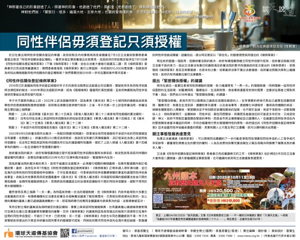 如果立法會通過《條例草案》,可以預視同志團體的下一步行動是爭取同性領養和同性伴侶的人工受孕或代孕安排等,嚴重侵犯將會出生的嬰兒的權利,人為及故意地剝奪兒童由親生父親及母親共同撫養下健康成長的基本人權。
