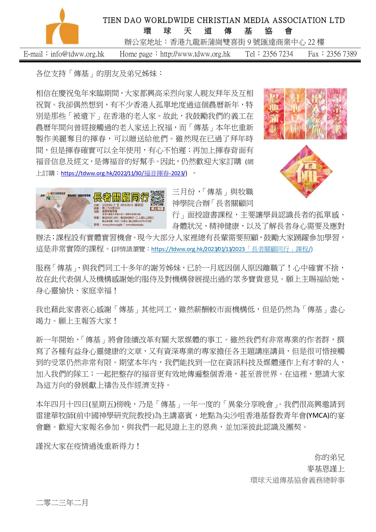 相信在慶祝兔年來臨期間,大家都興高采烈向家人親友拜年及互相祝賀。我卻偶然想到,有不少香港人孤單地度過這個農曆新年,特別是那些「被遺下」在香港的老人家。故此,我鼓勵我們的義工在農曆年間向曾經接觸過的老人家送上祝福,而「傳基」本年也重新製作美麗奪目的揮春,可以贈送給他們。雖然現在已過了拜年時間,但是揮春確實可以全年使用,有心不怕遲;再加上揮春背面有福音信息及經文,是傳福音的好幫手。因此,仍然歡迎大家訂購 (網上訂購:https://tdww.org.hk/2022/11/30/福音揮春-2023/) 。