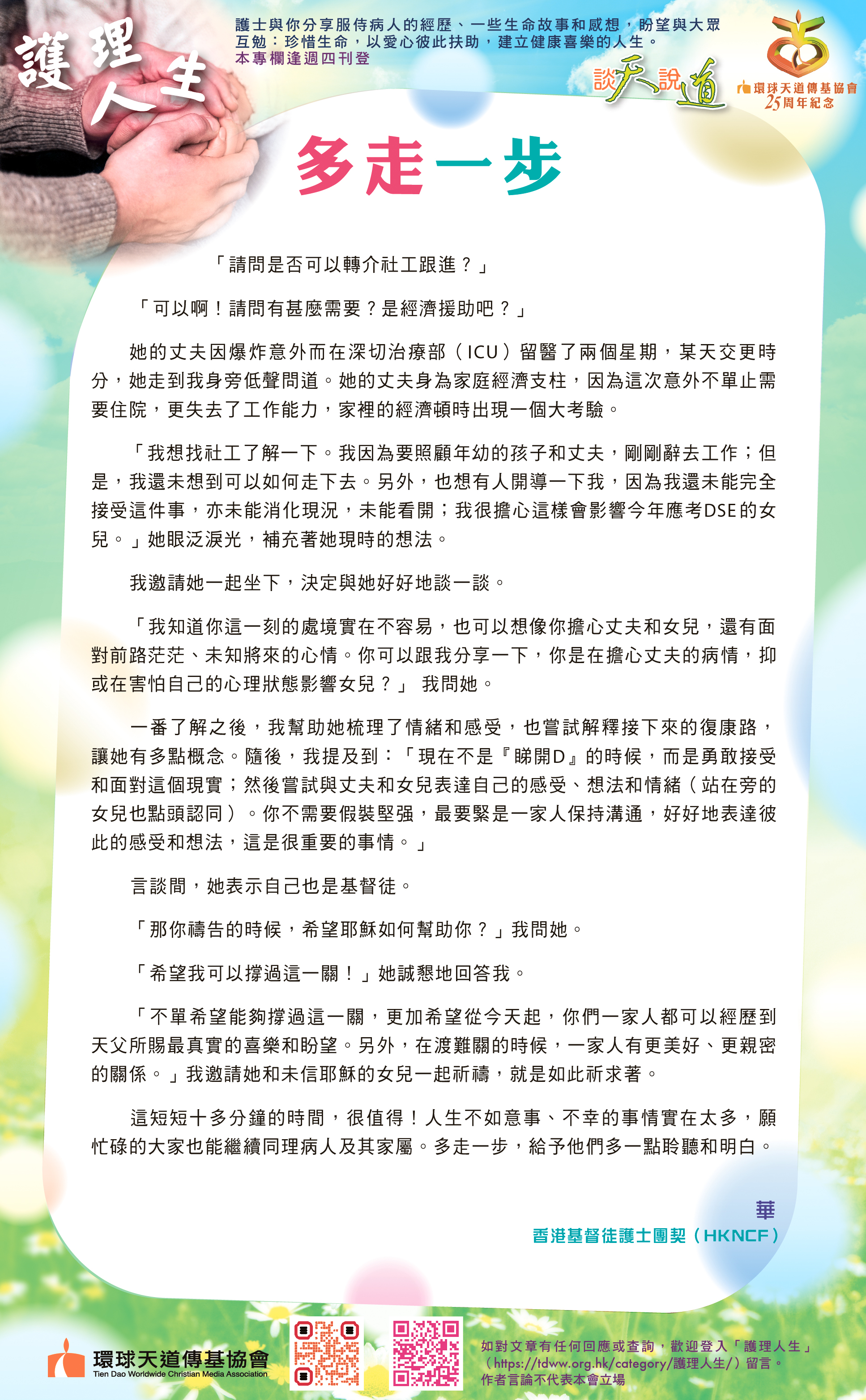 身為醫護人員,我們要面對自己家庭和身心的需要之外,很多時要面對工作上及來自醫患的壓力和困境。我們不僅需要應對各種突發的情況及家屬的質詢,而較有年資的同事更要肩負不同的行政職責和培訓後輩的重任。有多重身份和角色,要做到「公私分明」,放工就放下一切重擔,談何容易?