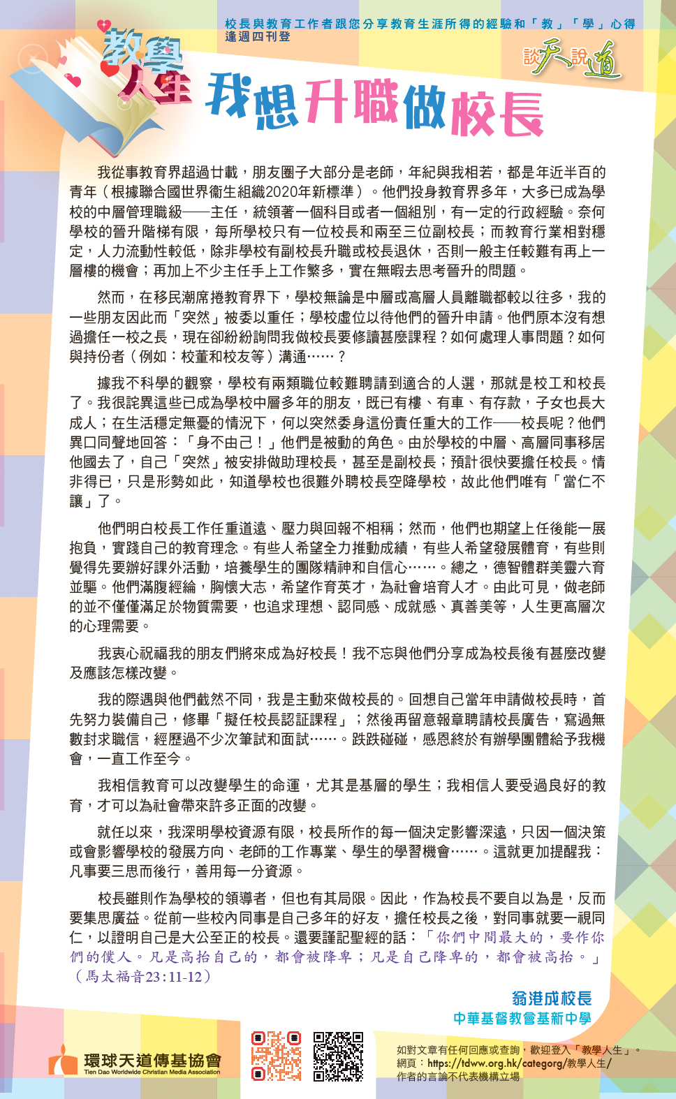 亞行,時間過得真快,轉眼間你們已過了英國一年。當初你們兩夫婦向我辭職,我問你們放棄這份穩定的教學工作,到英國去幹甚麼?你說:「校長,我打算到英國後,沖咖啡謀生。」我說:「哪會有外國人飲你的港式咖啡?太冒險了!」你回了我一句:「校長,你放心吧!我們有的是青春。」對,近來有一大伙年輕老師移民,他們沒有整全的計劃,心口掛著「勇」字便出發了。期望他們在彼邦生活愜意,得蒙主拖帶,走出燦爛的將來。