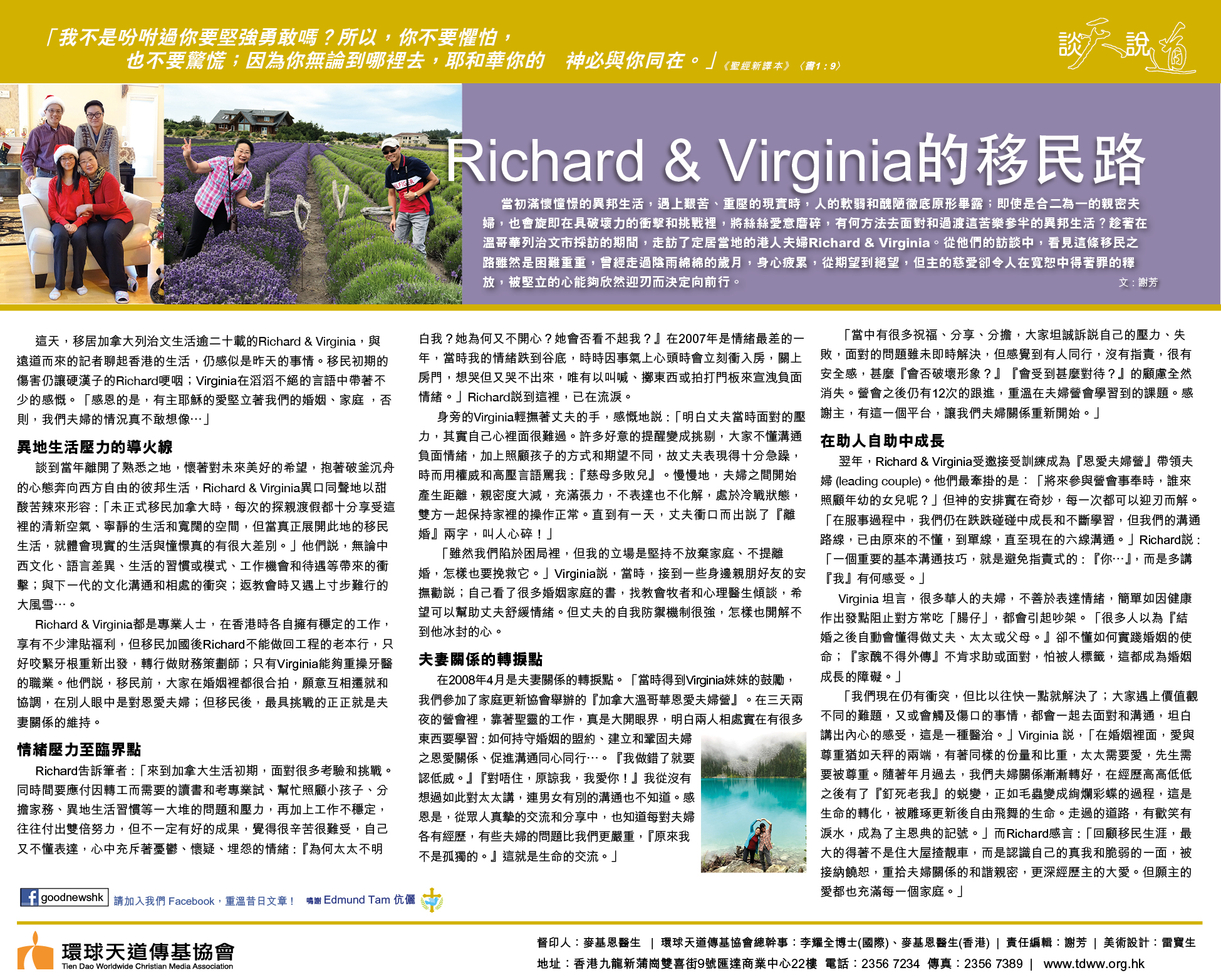 當初滿懷憧憬的異邦生活,遇上艱苦、重壓的現實時,人的軟弱和醜陋徹底原形畢露;即使是合二為一的親密夫婦,也會旋即在具破壞力的衝擊和挑戰裡,將絲絲愛意磨碎,有何方法去面對和過渡這苦樂參半的異邦生活?趁著在溫哥華列治文市採訪的期間,走訪了定居當地的港人夫婦Richard & Virginia。從他們的訪談中,看見這條移民之路雖然是困難重重,曾經走過陰雨綿綿的歲月,身心疲累,從期望到絕望,但主的慈愛卻令人在寬恕中得著罪的釋放,被堅立的心能夠欣然迎刃而決定向前行。