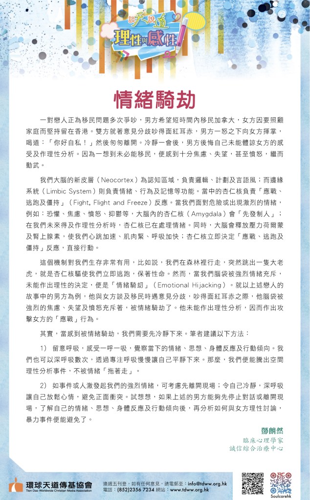 「雖然我們陷於困局裡,但我的立場是堅持不放棄家庭、不提離婚,怎樣也要挽救它。」Virginia說,當時,接到一些身邊親朋好友的安撫勸說;自己看了很多婚姻家庭的書,找教會牧者和心理醫生傾談,希望可以幫助丈夫舒緩情緒。但丈夫的自我防禦機制很強,怎樣也開解不到他冰封的心。