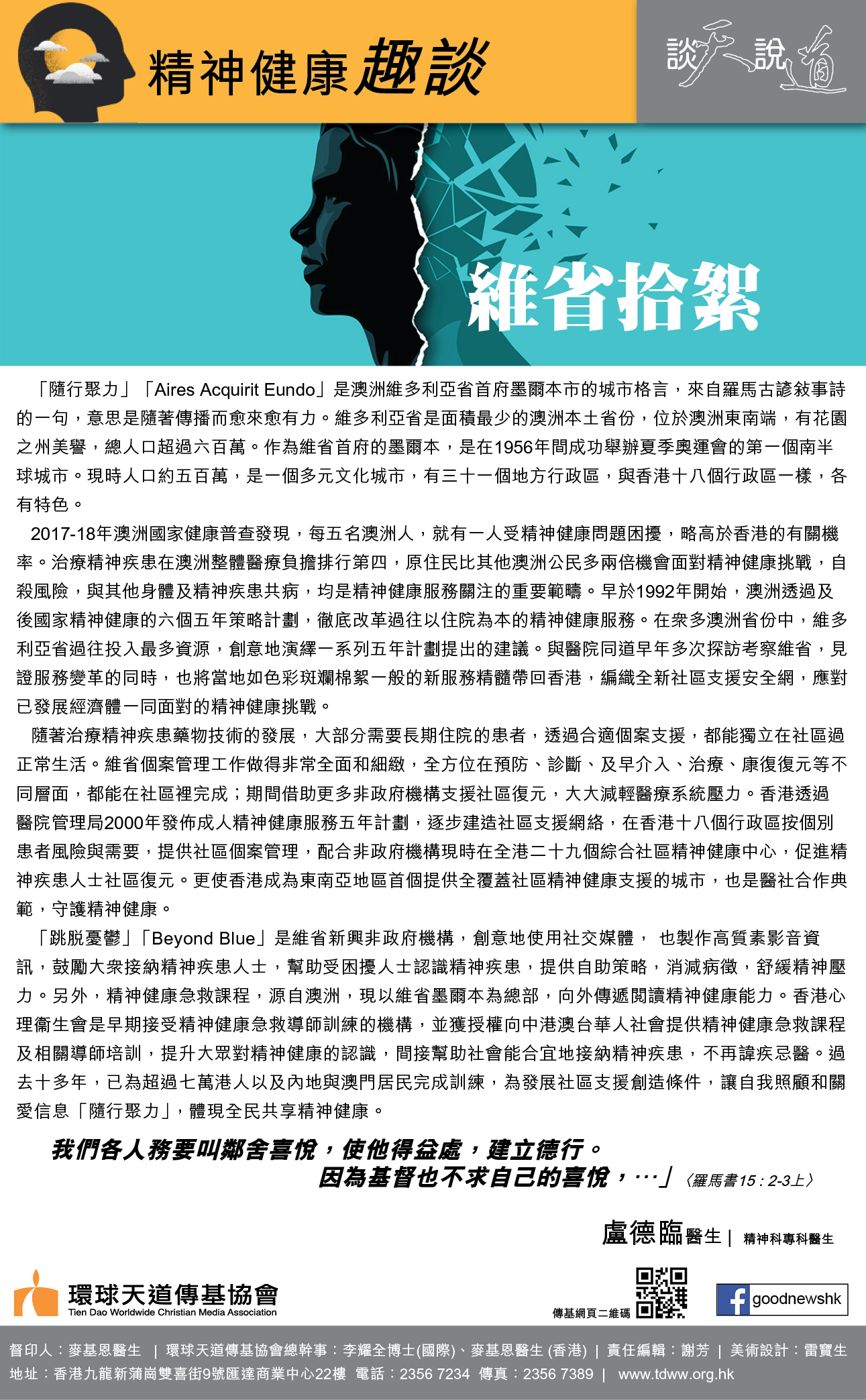 由六位資深的基督徒精神科專家撰稿,分享日常生活比較容易遇上的精神狀況,在其中再進行深入一點的講解,幫助讀者了解精神健康並對身邊有這方面需要的人予以諒解,甚或作出安慰;在發現他們有需要的時候,懂得協助他們尋求專業的幫助。從實際層面教育並呼籲,社會大眾若能對精神疾病及其適當處理方法有所認識,應該可以大大減少「標籤」效應;讓精神康復者不受歧視地融入社會生活之中。
