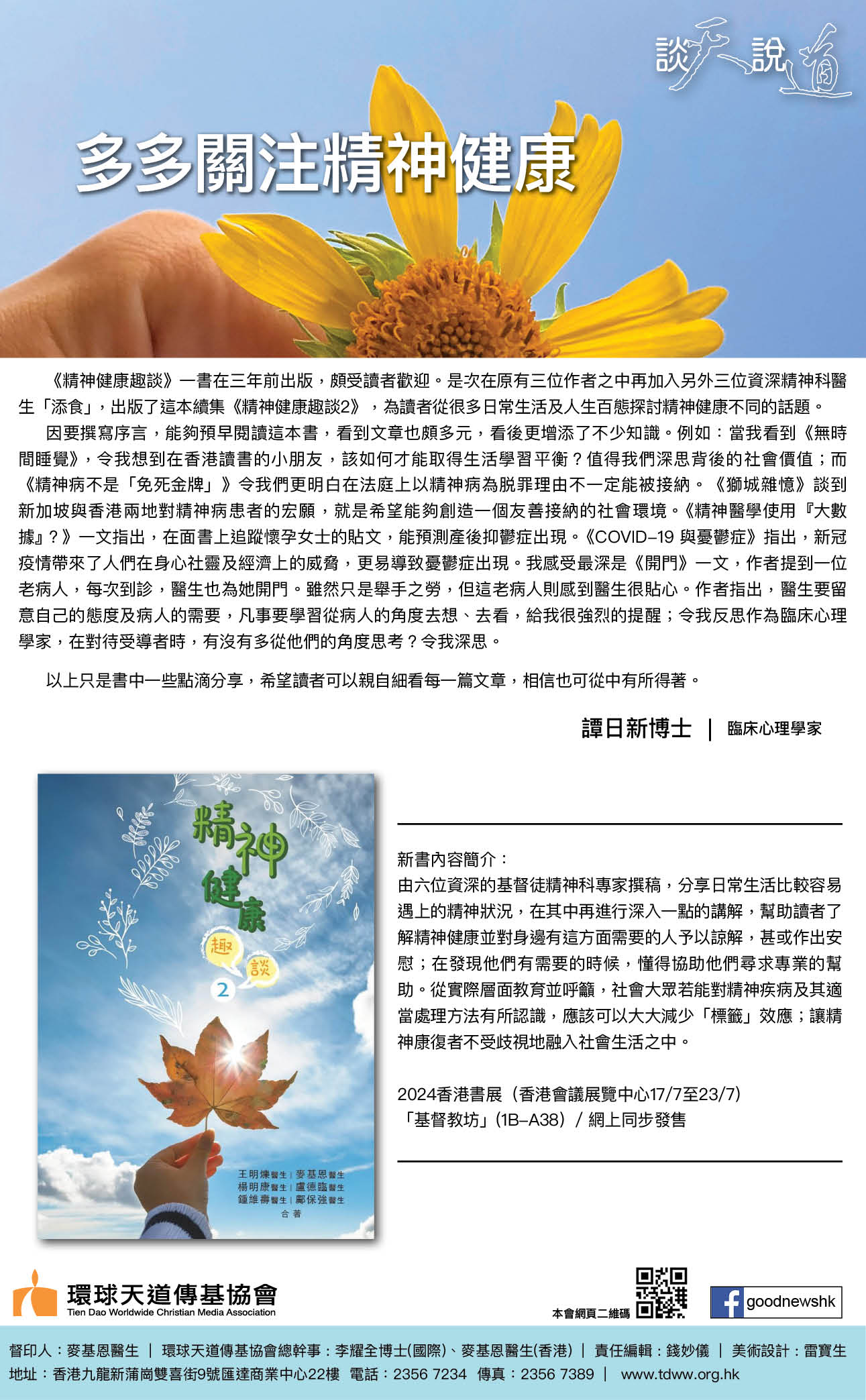 因要撰寫序言,能夠預早閱讀這本書,看到文章也頗多元,看後更增添了不少知識。例如:當我看到《無時間睡覺》,令我想到在香港讀書的小朋友,該如何才能取得生活學習平衡?值得我們深思背後的社會價值;而《精神病不是「免死金牌」》令我們更明白在法庭上以精神病為脱罪理由不一定能被接納。《獅城雜憶》談到新加坡與香港兩地對精神病患者的宏願,就是希望能夠創造一個友善接納的社會環境。《精神醫學使用『大數據』?》一文指出,在面書上追蹤懷孕女士的貼文,能預測產後抑鬱症出現。《COVID-19 與憂鬱症》指出,新冠疫情帶來了人們在身心社靈及經濟上的威脅,更易導致憂鬱症出現。我感受最深是《開門》一文,作者提到一位老病人,每次到診,醫生也為她開門。雖然只是舉手之勞,但這老病人則感到醫生很貼心。作者指出,醫生要留意自己的態度及病人的需要,凡事要學習從病人的角度去想、去看,給我很強烈的提醒;令我反思作為臨床心理學家,在對待受導者時,有沒有多從他們的角度思考?令我深思。