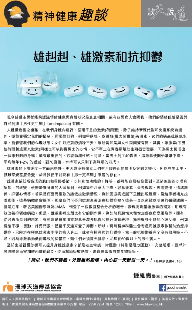 現今普遍市民都能夠認識情緒健康與身體狀況是息息相關,故有些男病人會問我,他們的情緒低落是否與自己到達「男性更年期」(andropause)有關。