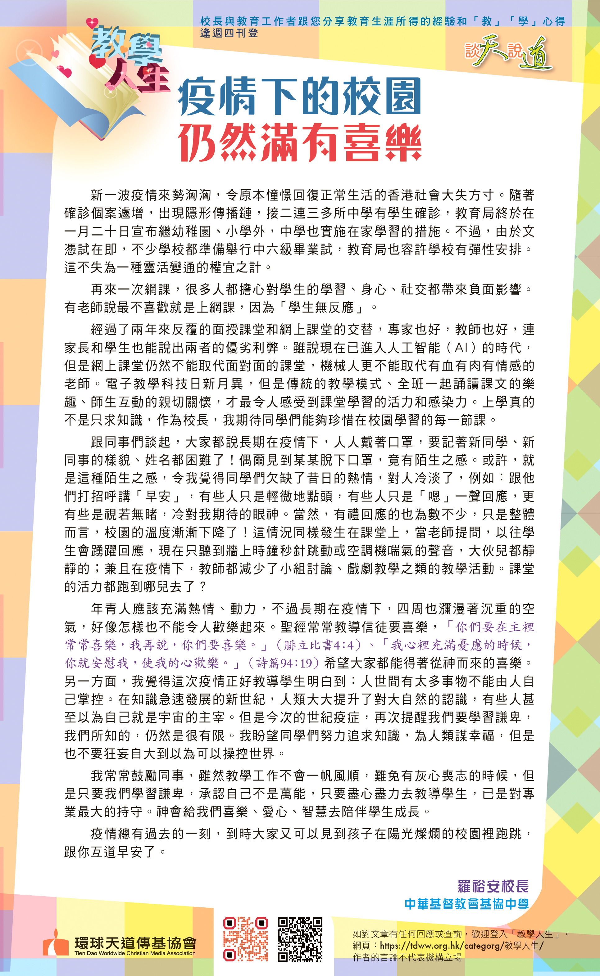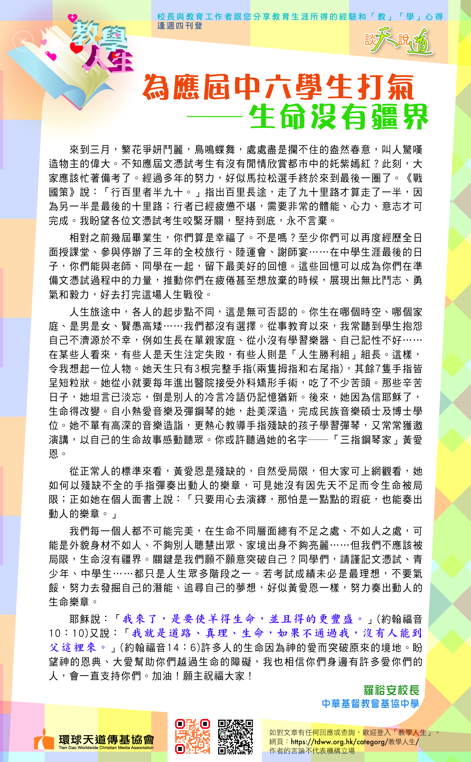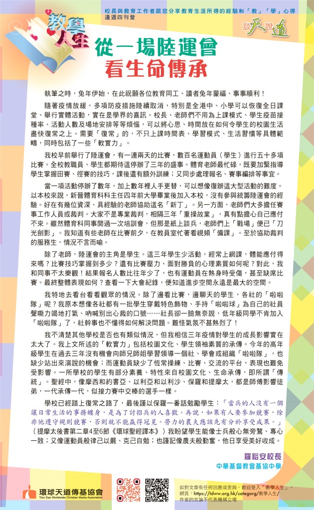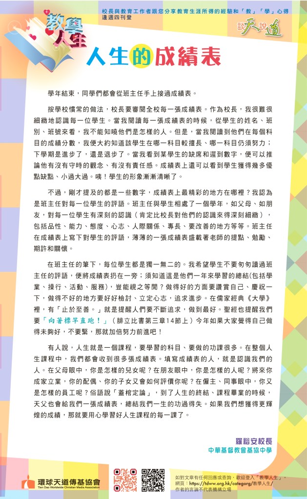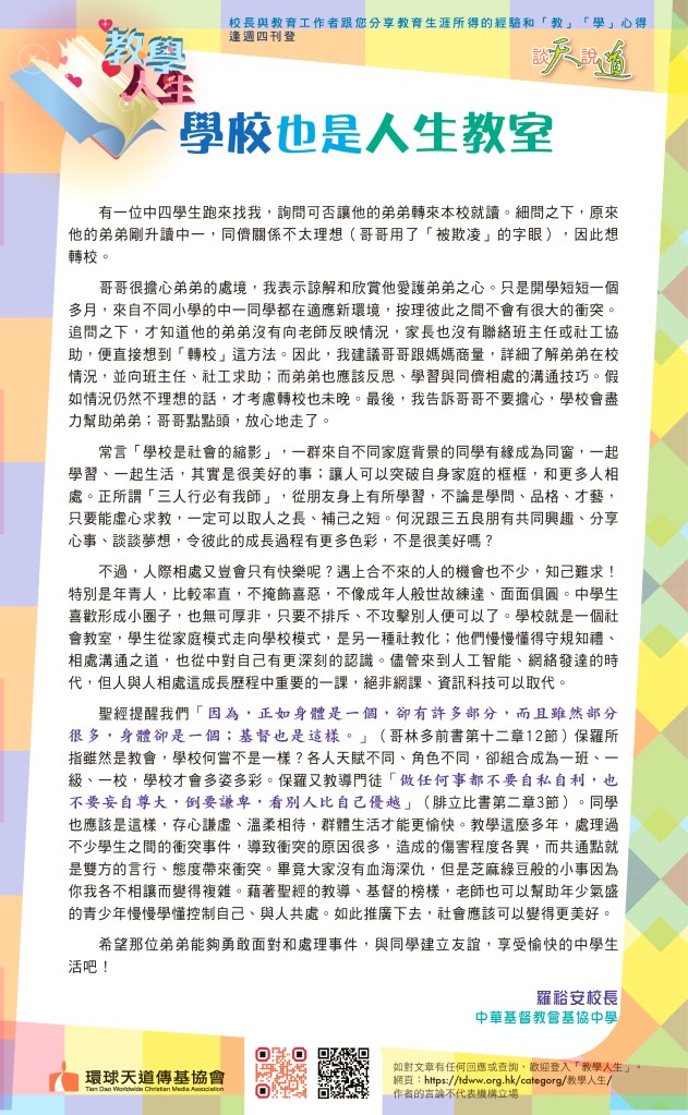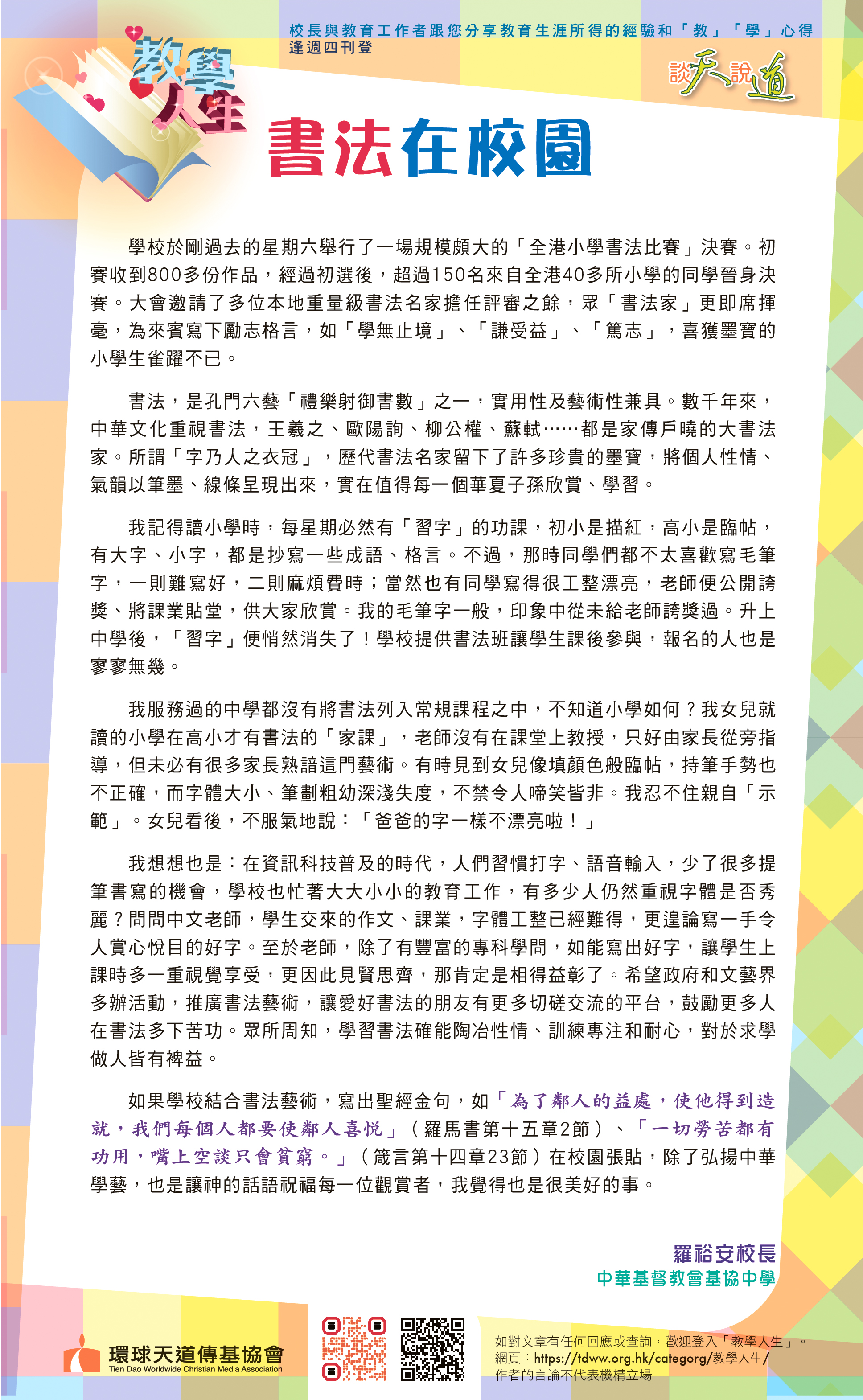 如果學校結合書法藝術,寫出聖經金句,如「為了鄰人的益處,使他得到造就,我們每個人都要使鄰人喜悅」(羅馬書第十五章2節)、「一切勞苦都有功用,嘴上空談只會貧窮。」(箴言第十四章23節)在校園張貼,除了弘揚中華學藝,也是讓神的話語祝福每一位觀賞者,我覺得也是很美好的事。