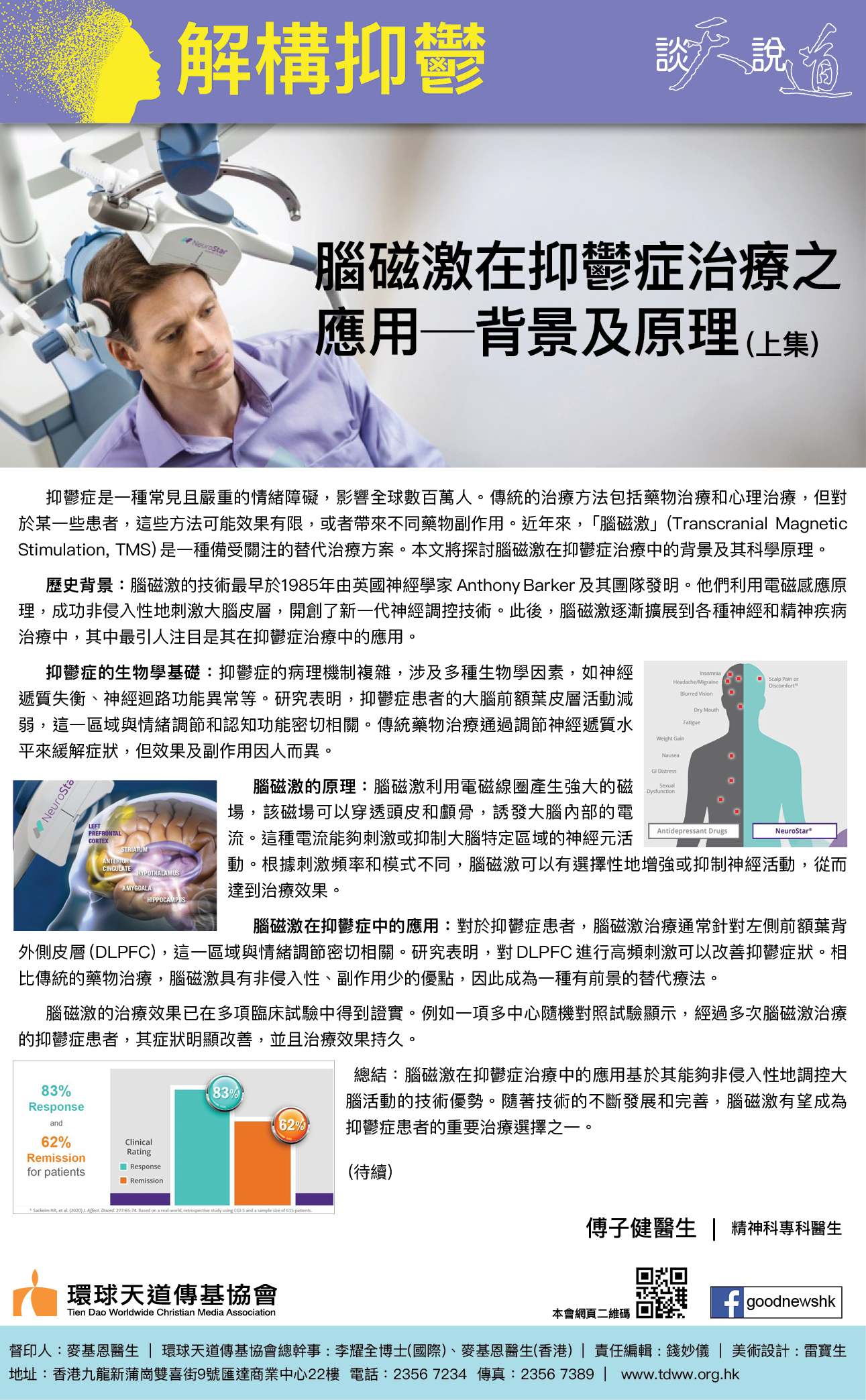 上文(24/12)提到,腦磁激的治療效果已在多項臨床試驗中得到證實,例如一項多中心隨機對照試驗顯示,經過多次腦磁激治療的抑鬱症患者,其症狀明顯改善,並且治療效果持久。總括來說,腦磁激在抑鬱症治療中的應用基於其能夠非侵入性地調控大腦活動的技術優勢。隨著技術不斷發展和完善,腦磁激有望成為抑鬱症患者的重要治療選擇之一。