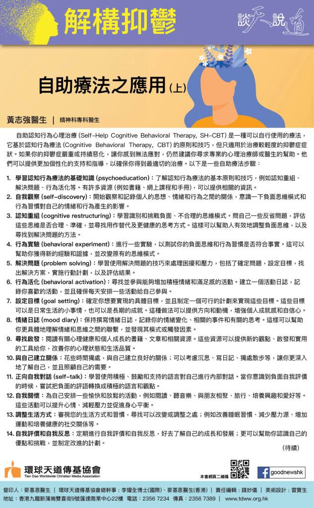自助認知行為心理治療(Self-Help Cognitive Behavioral Therapy, SH-CBT)是一種可以自行使用的療法,它基於認知行為療法(Cognitive Behavioral Therapy, CBT)的原則和技巧,但只適用於較輕度的抑鬱症症狀。如果你的抑鬱症嚴重或持續惡化,讓你感到無法應對,仍然建議你尋求專業的心理治療師或醫生的幫助。他們可以提供更加個性化的支持和指導,以確保你得到最適切的治療。上兩期文章《自助療法之應用(上)》、《自助療法之應用(下)》已經提及了相關的自助療法的應用步驟。當整合應用出來之後,預計會產生下列這些結果: