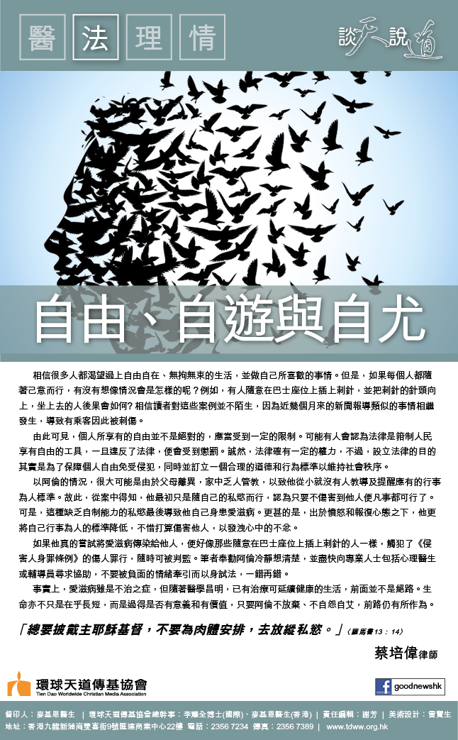 從問題的關鍵方面看,阿倫長時間誤用了他的自由,過著放蕩不羈的生活;更在社交網路上交友,隨意發展一夜情而患上愛滋病,責任何在?這是真正的自由嗎?真正的自由並非隨心所欲,乃是用自由作智慧的選擇,不求即時的性慾之滿足,乃求真正的喜樂,過著美好、滿足和有意義的人生。