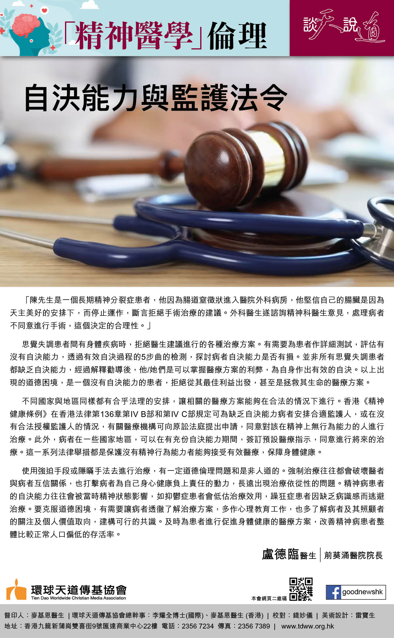 「陳先生是一個長期精神分裂症患者,他因為腸道窒徵狀進入醫院外科病房,他堅信自己的腸臟是因為天主美好的安排下,而停止運作,斷言拒絕手術治療的建議。外科醫生遂諮詢精神科醫生意見,處理病者不同意進行手術,這個決定的合理性。」