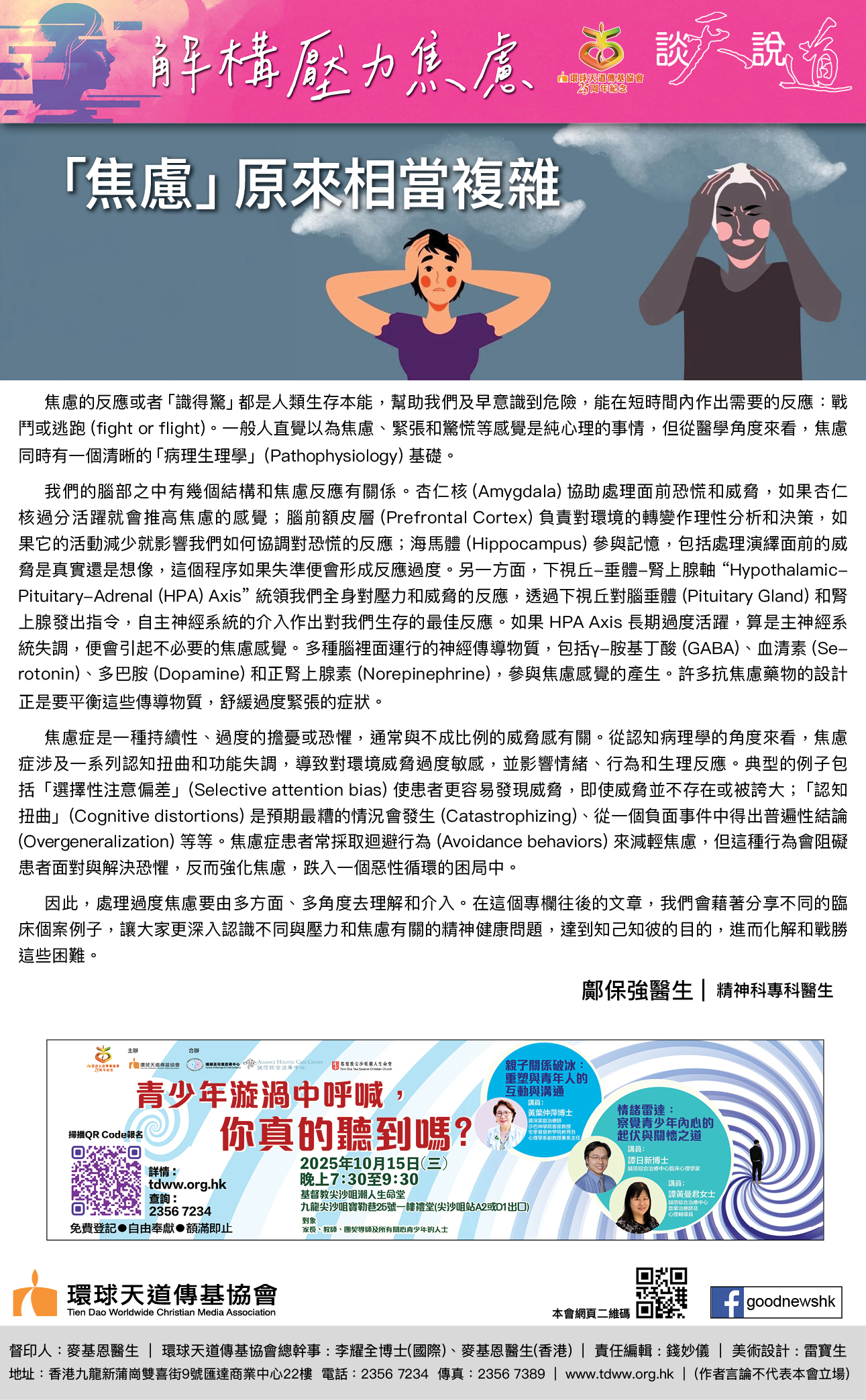 5. 大腦與神經生理因素:大腦中負責處理恐懼和情緒的區域(特別是杏仁核)可能過度活躍或功能異常。神經傳導物質(如血清素、GABA)系統失衡,也被認為與焦慮和恐懼反應的調節失常有關。