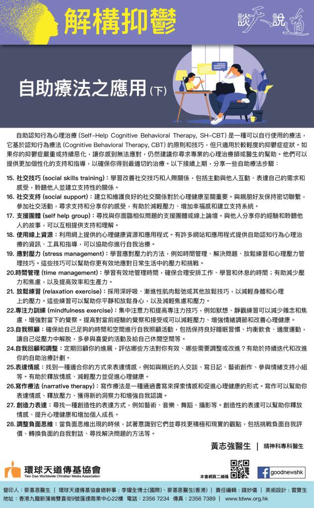 香港精神科專科醫生黃明爍鼓勵抑鬱症患者勇於求助。他解釋,以目前精神醫學發展,抑鬱症有藥物及非藥物治療方法,各有優點;因此抑鬱症在正確的診斷及治療下可以痊癒。