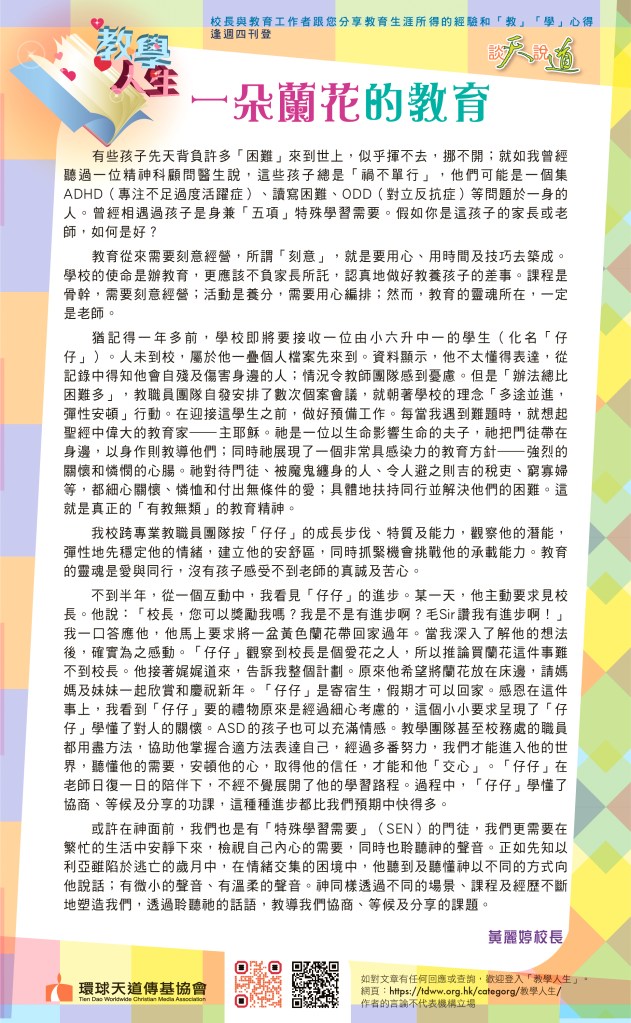 猶記得一年多前,學校即將要接收一位由小六升中一的學生(化名「仔仔」)。人未到校,屬於他一疊個人檔案先來到。資料顯示,他不太懂得表達,從記錄中得知他會自殘及傷害身邊的人;情況令教師團隊感到憂慮。但是「辦法總比困難多」,教職員團隊自發安排了數次個案會議,就朝著學校的理念「多途並進,彈性安頓」行動。在迎接這學生之前,做好預備工作。每當我遇到難題時,就想起聖經中偉大的教育家——主耶穌。祂是一位以生命影響生命的夫子,祂把門徒帶在身邊,以身作則教導他們;同時祂展現了一個非常具感染力的教育方針──強烈的關懷和憐憫的心腸。祂對待門徒、被魔鬼纏身的人、令人避之則吉的稅吏、窮寡婦等,都細心關懷、憐恤和付出無條件的愛;具體地扶持同行並解決他們的困難。這就是真正的「有教無類」的教育精神。