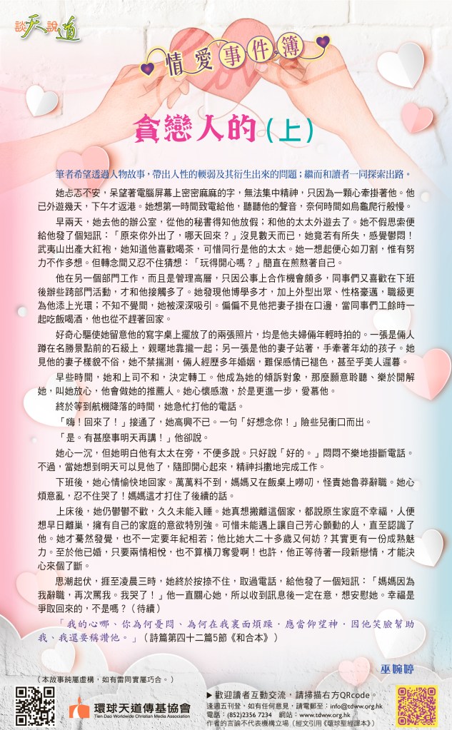 等候他回覆,簡直是度日如年;最難過是數天後,他仍無音訊。為何會這樣?他那麼關心她,是出於甚麼?不應該是「神女有心,襄王無夢」吧?她搜索枯腸,過往倆人相處中,曾有火花的蜘絲馬跡,思念之苦煎熬著她。她只好再次電郵他。她打了主題:「禱告」,內容則是一連串的星星,暗示一切盡在不言中。最後,她豁出去了,加上「想念你!」