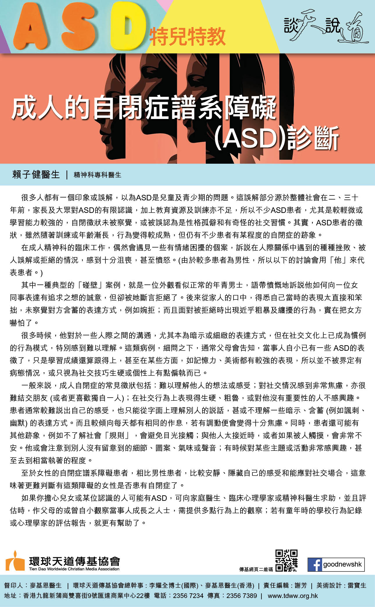 承蒙亞洲精神藥物學醫學會的委托,在過去一年,把學會的一個特別研究ADHD的專家小組組員的文章,交由環球天道傳基協會在「談天說道」版面上的專欄(逢星期三刊登)發表,內容既介紹有關科研進展,又提供一些有效專業方法去幫助患者調適,以及為他們身邊教養或照顧之人士提供正確信息和教育,為關懷有特殊需要的群體作出不少貢獻。現將各專家的文章彙集成書﹕《大器晚成—ADHD特兒特教》,以饗讀者。