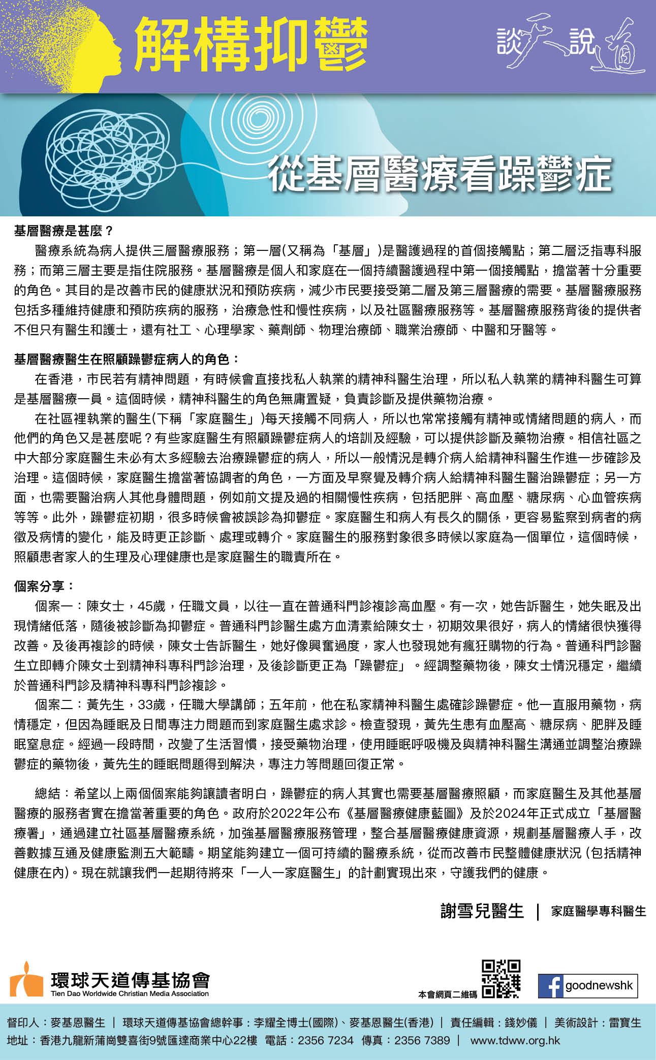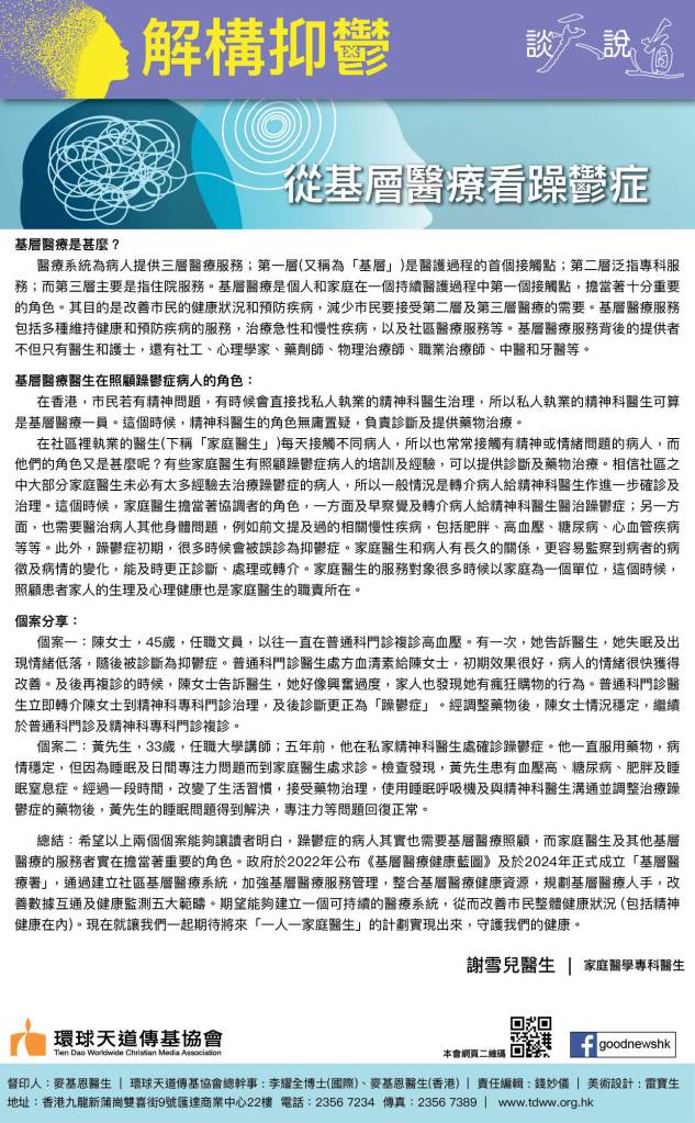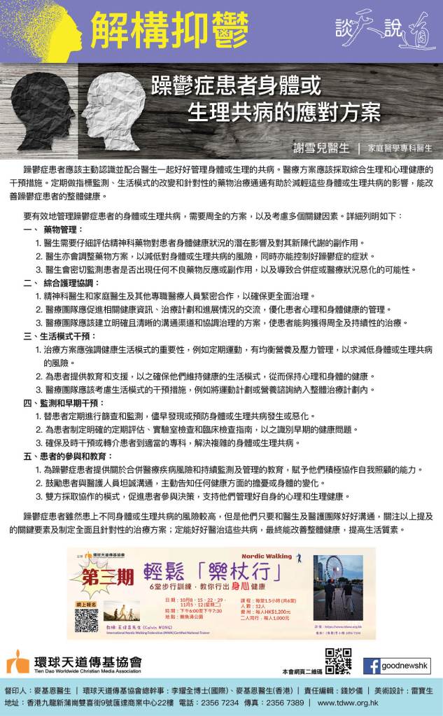 1. 抑鬱情緒:悲觀消極、感覺愁苦及悲慘,早上或入夜時分情況較為嚴重,甚至有死亡或自殺的想法;