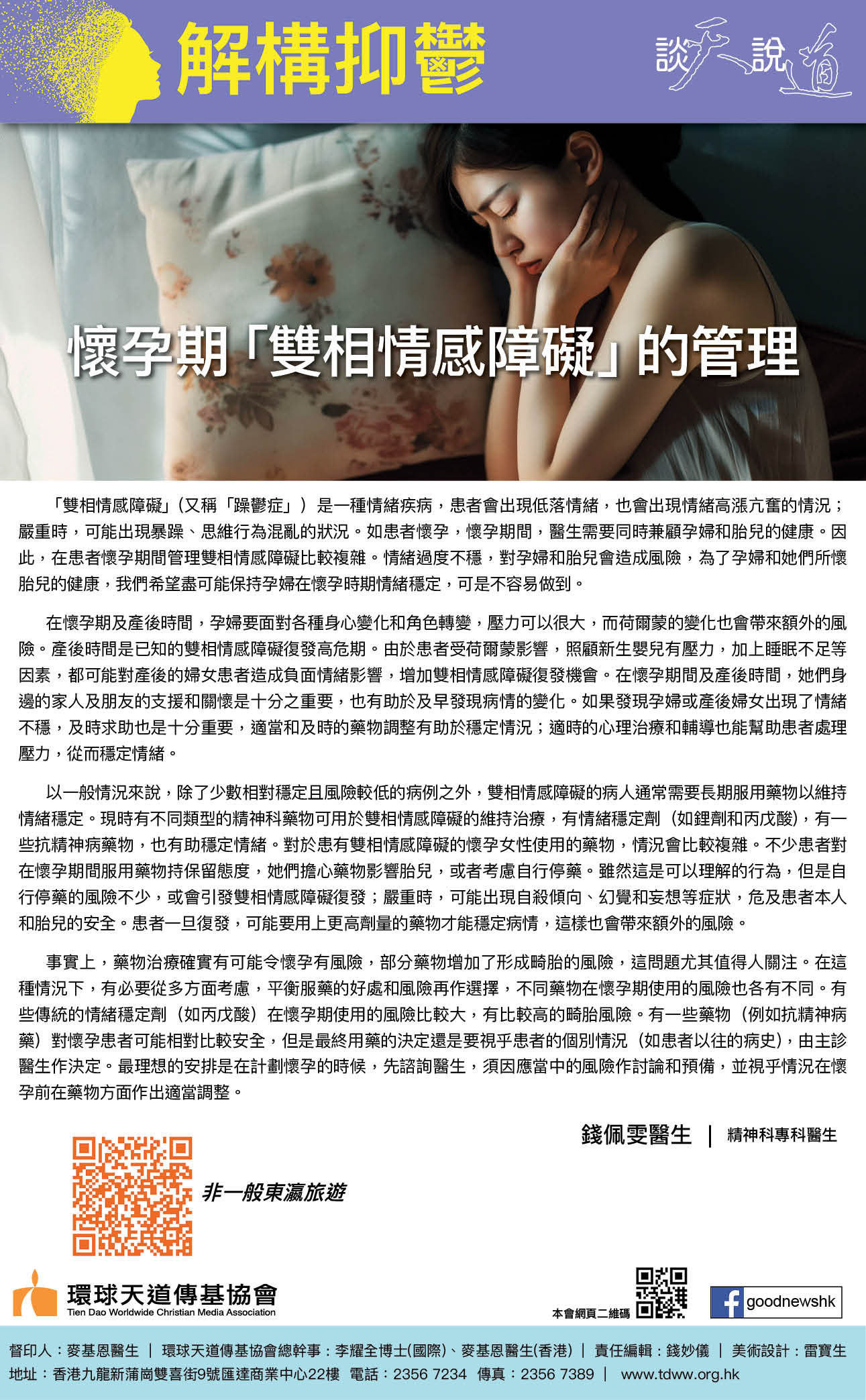 2025年10月在荷蘭阿姆斯特丹舉行的「歐洲神經精神藥物學會」(ECNP)國際會議上,來自法國的Gisele Apter教授對於這精神障礙發表了深入的分析。雖然世界衞生組織把「產後憂鬱症」定義為在懷孕及產後六星期之間出現憂鬱病徵(註一),但她認為需要把發病期延長至產後一年之內。當中原因是在發達國家之中,自殺及殺嬰出現時間往往在產後六星期至一年之間。至於發病率,雖然全球各地稍有不同,大致上每六位孕婦便有一位出現這種情況,而在貧窮國家及缺乏親友支援的家庭之中,發病機會相對更高。相比一般憂鬱症病徵,患有產後憂鬱的母親更容易出現各種焦慮,尤其是關於身旁嬰孩的問題。她更提及,在香港發病率比一般地方為低(約十分一左右),是與產前準確評估、診斷早期病徵並及早處理有關;由於及早於懷孕期間作出治理,大大減低病情嚴重程度(註二)。