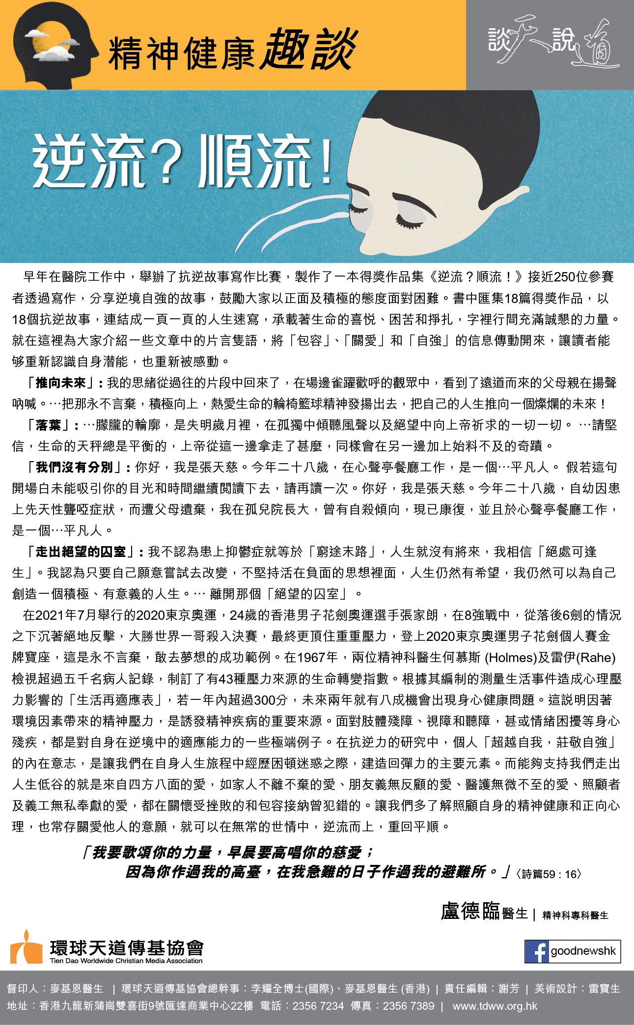 在2021年7月舉行的2020東京奧運,24歲的香港男子花劍奧運選手張家朗,在8強戰中,從落後6劍的情況之下沉著絶地反擊,大勝世界一哥殺入決賽,最終更頂住重重壓力,登上2020東京奧運男子花劍個人賽金牌寶座,這是永不言棄,敢去夢想的成功範例。在1967年,兩位精神科醫生何慕斯 (Holmes)及雷伊(Rahe)檢視超過五千名病人記錄,制訂了有43種壓力來源的生命轉變指數。根據其編制的測量生活事件造成心理壓力影響的「生活再適應表」,若一年內超過300分,未來兩年就有八成機會出現身心健康問題。這說明因著環境因素帶來的精神壓力,是誘發精神疾病的重要來源。面對肢體殘障、視障和聽障,甚或情緒困擾等身心殘疾,都是對自身在逆境中的適應能力的一些極端例子。在抗逆力的研究中,個人「超越自我,莊敬自強」的內在意志,是讓我們在自身人生旅程中經歷困頓迷惑之際,建造回彈力的主要元素。而能夠支持我們走出人生低谷的就是來自四方八面的愛,如家人不離不棄的愛、朋友義無反顧的愛、醫護無微不至的愛、照顧者及義工無私奉獻的愛,都在關懷受挫敗的和包容接納曾犯錯的。讓我們多了解照顧自身的精神健康和正向心理,也常存關愛他人的意願,就可以在無常的世情中,逆流而上,重回平順。  「我要歌頌你的力量,早晨要高唱你的慈愛;因為你作過我的高臺,在我急難的日子作過我的避難所。」〈詩篇59﹕16〉