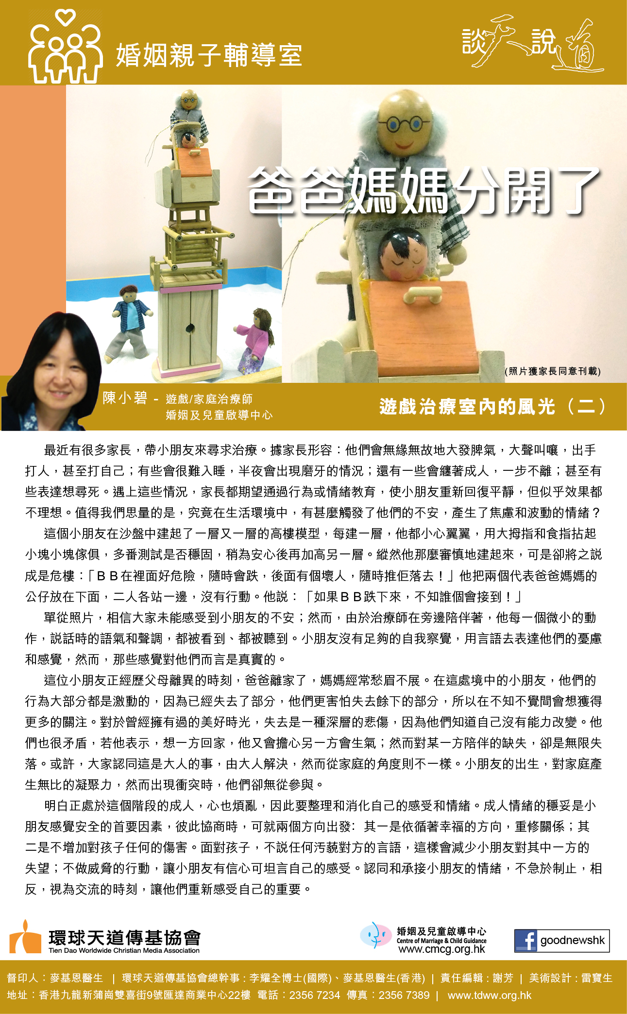「贐明會的兒童哀傷輔導服務,是運用不同的方式為進行,「遊戲治療」(Play Therapy)的方式是其中一種。在遊戲室裡,透過玩遊戲,同個案中的兒童談生死離別、喜怒哀樂;讓孩子表達出自己的想法、感受、經驗、需要和渴望等,藉以整理自己的哀傷經歷和情緒。輔導的媒介包括玩玩具、藝術創作、角色扮演、繪本閱讀、講故事、寫信件,以及一些模擬家庭環境或醫院環境的器材,如醫院模型、小棺材、廚房煮飯用具等,在遊戲之中他們重新回到令他們困擾的情境,在輔導員的陪伴下,為自己壓抑在心底的情緒找到抒發途徑。在輔導孩子外,輔導員也會邀請家長進行個別的面談,了解孩子及家長的狀況及困難,以協助他們共同面對哀傷。」他說,家長在協助孩子適應親人離世而感到困難,又或觀察到孩子持續出現一些反常的情況,影響著日常生活和別人的相處,甚至傷害自己或他人,便應盡快尋求專業的輔導服務。
