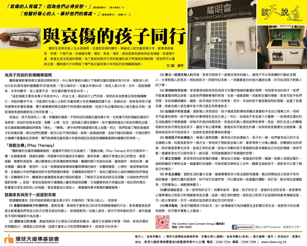 「這些個案主要來自青少年綜合中心,約佔七成;兩成自行上門求助,其他的來自教會及其他機構轉介。求助的數字不多,可能源於社會人士對於兒童或青少年哀傷輔導認識不足。至親去世,對家長和孩子都同樣帶來影響和傷痛,雙方都需要時間去面對不同哀傷的過渡期,但孩子未必懂得如成人般主動去求助,甚或清楚表達喪親對自己有何影響。」