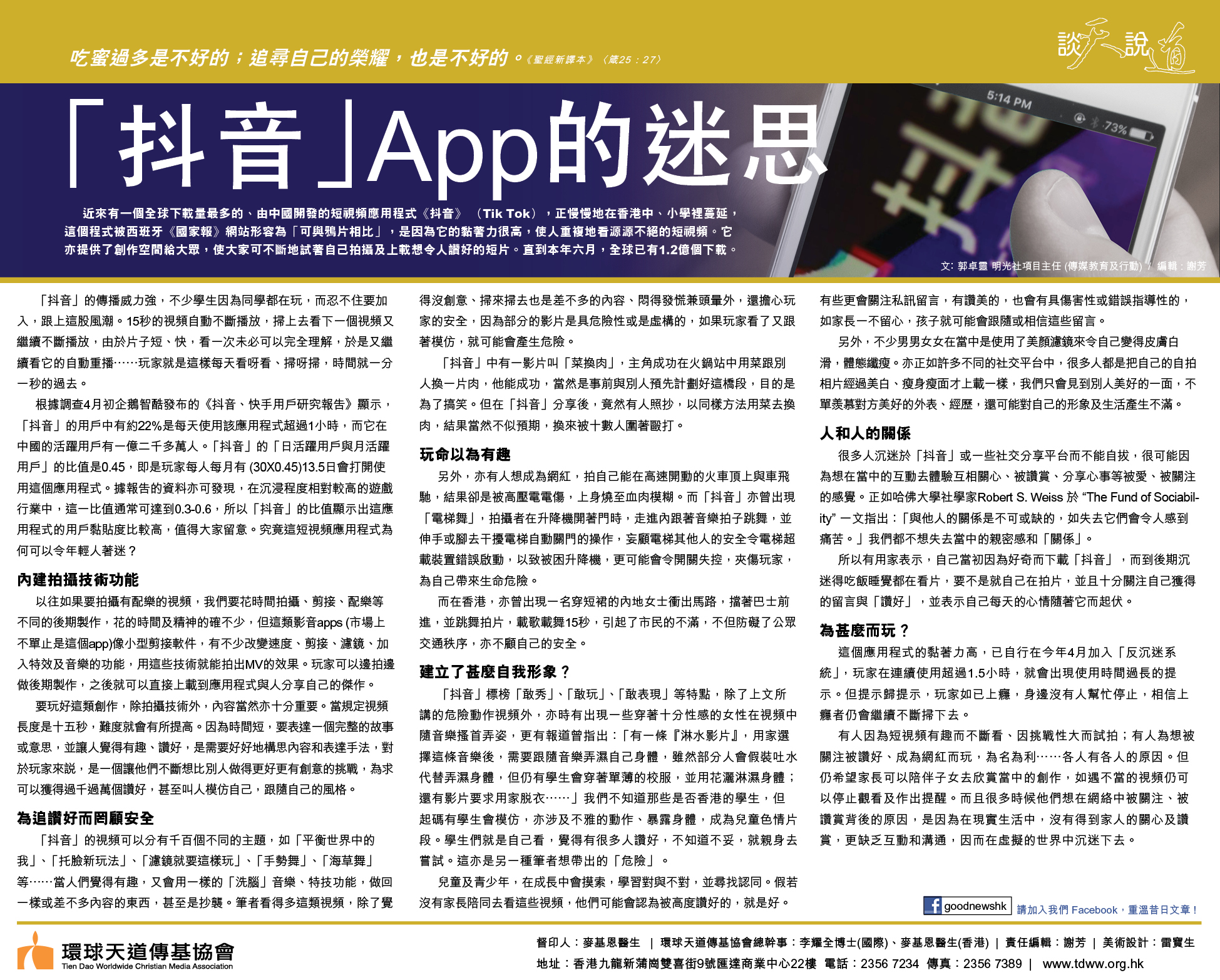 近來有一個全球下載量最多的、由中國開發的短視頻應用程式《抖音》 (Tik Tok),正慢慢地在香港中、小學裡蔓延,這個程式被西班牙《國家報》網站形容為「可與鴉片相比」,是因為它的黏著力很高,使人重複地看源源不絕的短視頻。它亦提供了創作空間給大眾,使大家可不斷地試著自己拍攝及上載想令人讚好的短片。直到本年六月,全球已有1.2億個下載。