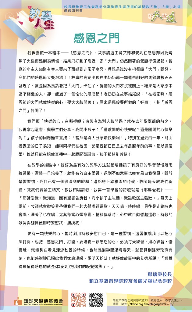 我很喜歡一本繪本──《感恩之門》。故事講述主角艾德和安妮在感恩節因為烤焦了火雞而感到很懊惱,結果只好到了附近一家「大門」仍然開著的餐廳準備過節。餐廳的小主人知道有客人要來了而感到非常不高興,埋怨是誰沒有把餐廳「大門」關好,令他們的感恩節大餐泡湯了!故事的高潮出現在老奶奶那一顆還未削好的馬鈴薯被爸爸發現了,就是因為馬鈴薯把「大門」卡住了,餐廳的大門才沒被關上。結果是大家原本互不相識的人,卻一起過了一個愉快的感恩節!老奶奶在故事結尾說:「在老家啊,感恩節的大門就像快樂的心,要大大敞開著!」原來是馬鈴薯所做的「好事」,把「感恩之門」打開了!