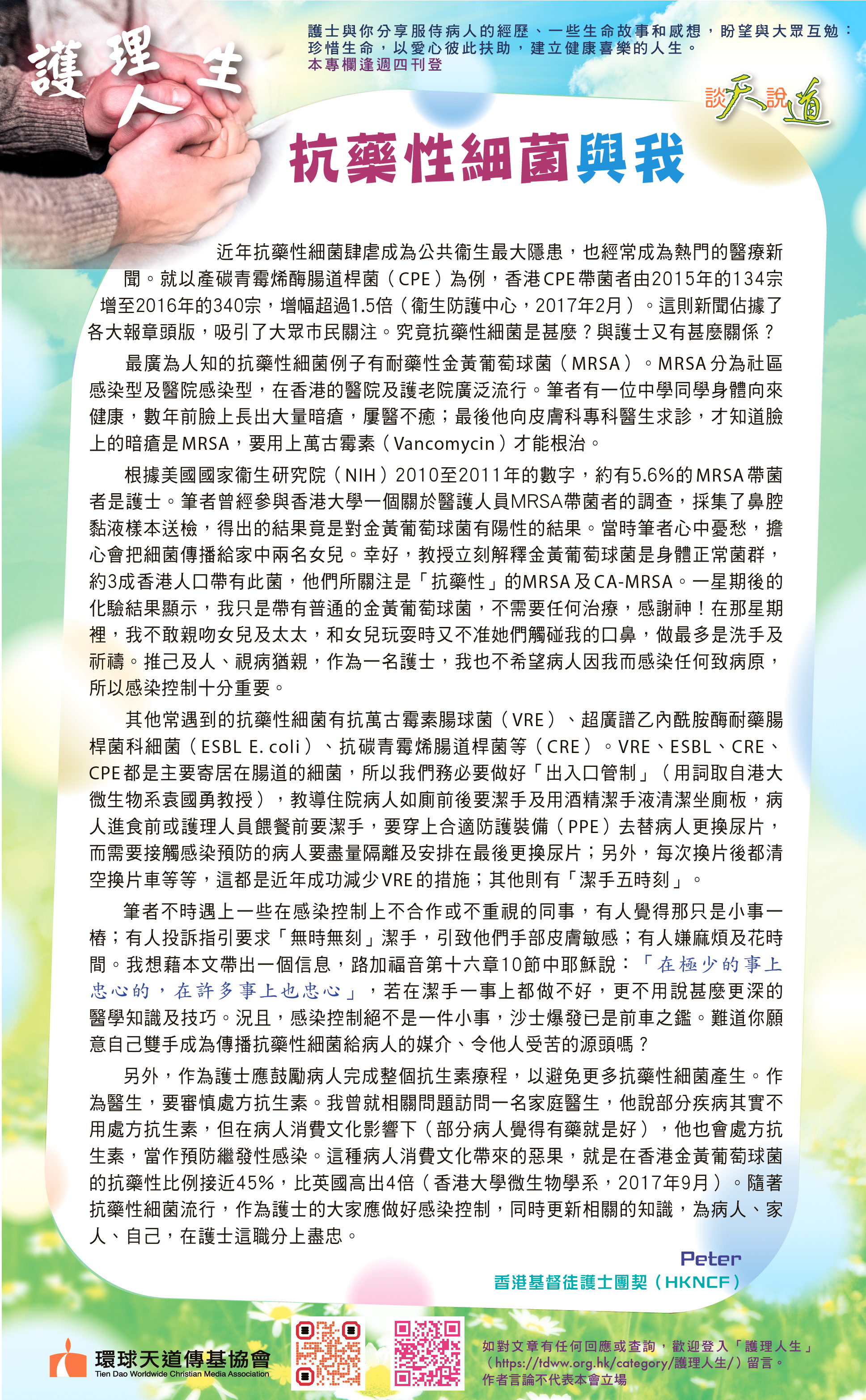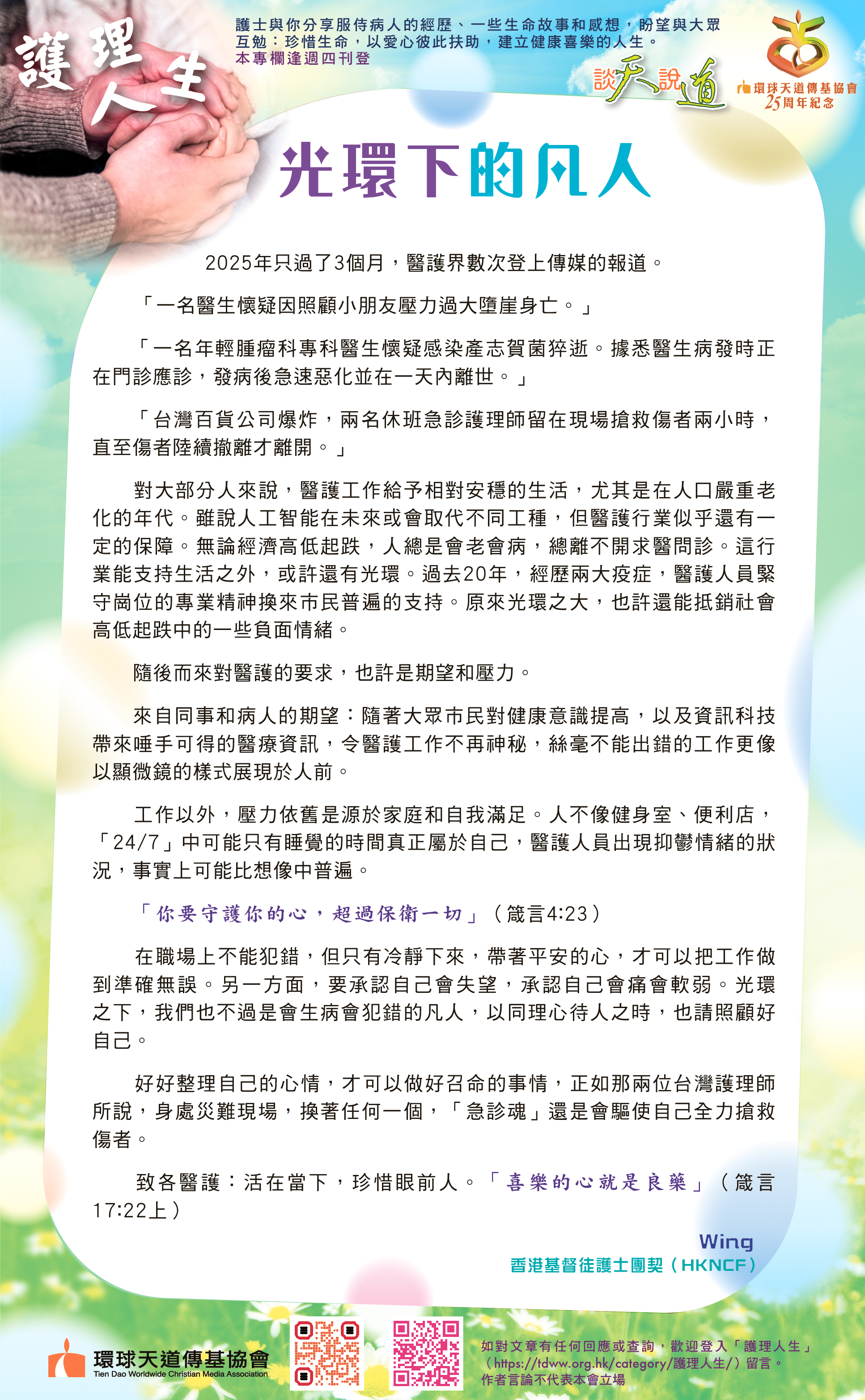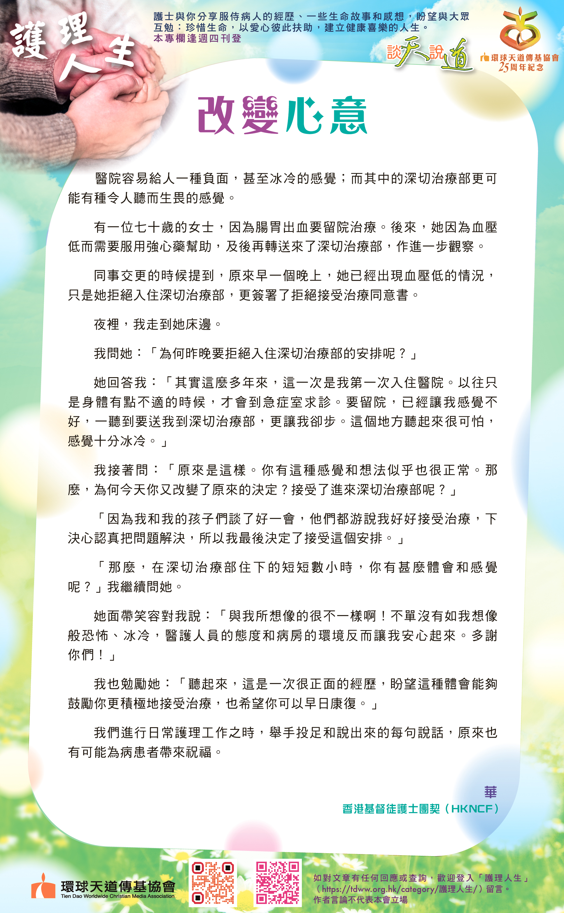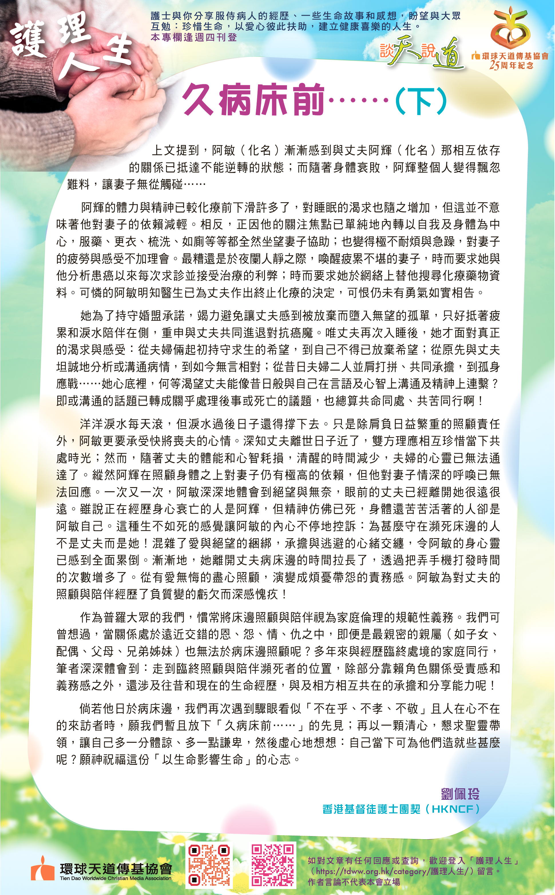 各位仍在前線拼搏、努力的戰友,好好珍惜每一個能夠為主作見證、傳福音的機會;不論對方是朋友、同事、病友或鄰舍。因為你和我都不知道生命還可以走多遠,但我們確知──唯有福音能真正拯救靈魂。