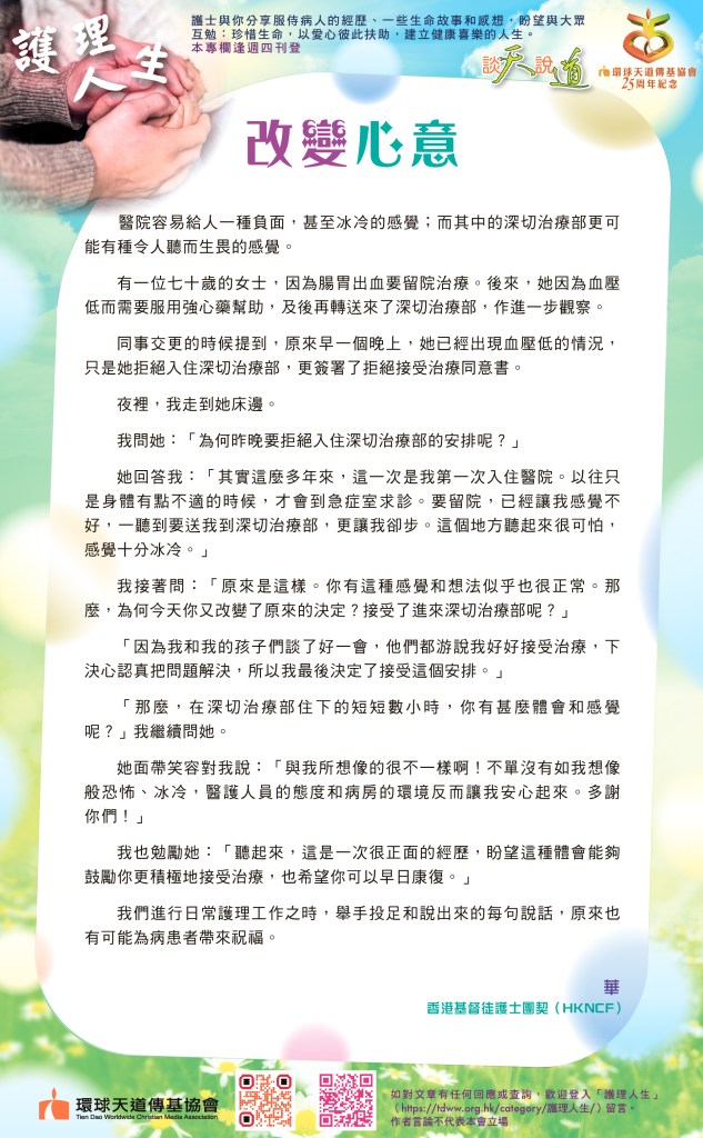 那天,我有機會趁他還清醒,還能說話的時候與他聊天。我們談到了很多他的過去和當下的感受:他經歷這麼多的事真是很痛苦,也後悔當初沒有好好珍惜與家人一起的時光。人生無常,只能與他分享寶貴的福音,也分享了過往與面對不同不幸遭遇的病友禱告的片段。最後他也接受了邀請,和我一起禱告;他緊緊地握著我的手,不單禱告求天父醫治他,也求天父賜給他最大、最真實的平安和恩典。禱告後,我勉勵他無論如何也不可放棄,更鼓勵他有機會就要好好與家人、女朋友表達自己的愛和感受。