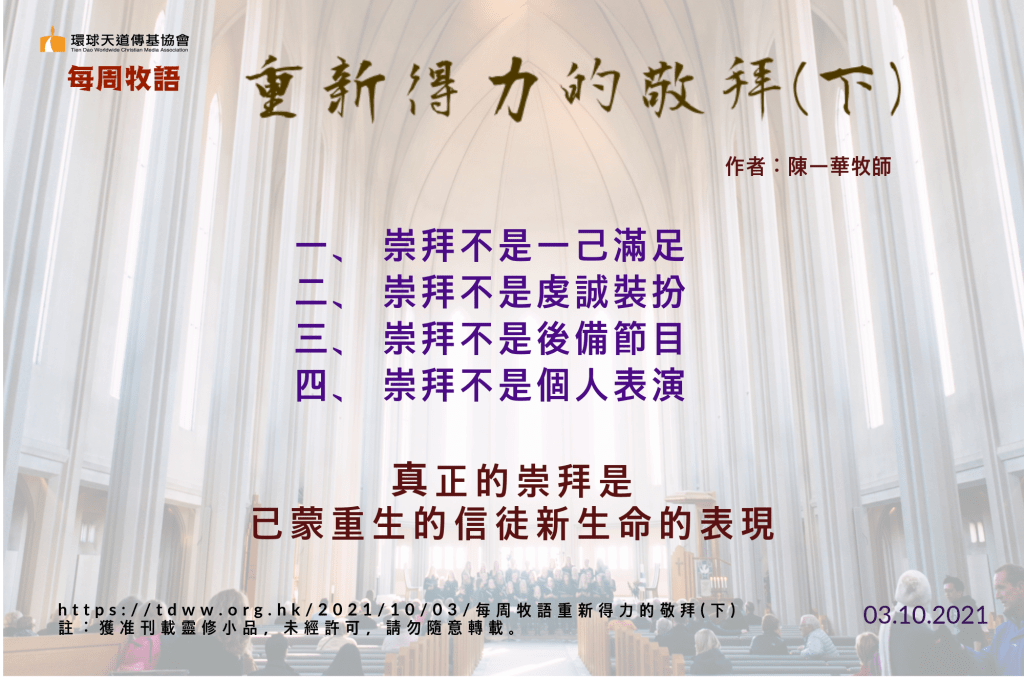 有人以為每周上教會崇拜,作兩小時的虔誠表現就足夠了,其餘時間則我行我素,生活依然故我。難怪這些人無法從崇拜中得著靈命的更新!