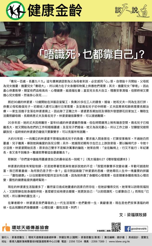 在筆者眼中,林婆婆是我們尊敬的上一代生活寫照。他們勤勞一生,貢獻香港,現在是他們安享清福的時候。在此祝願他們身體健康、心理壯健、靈性活潑。阿們!