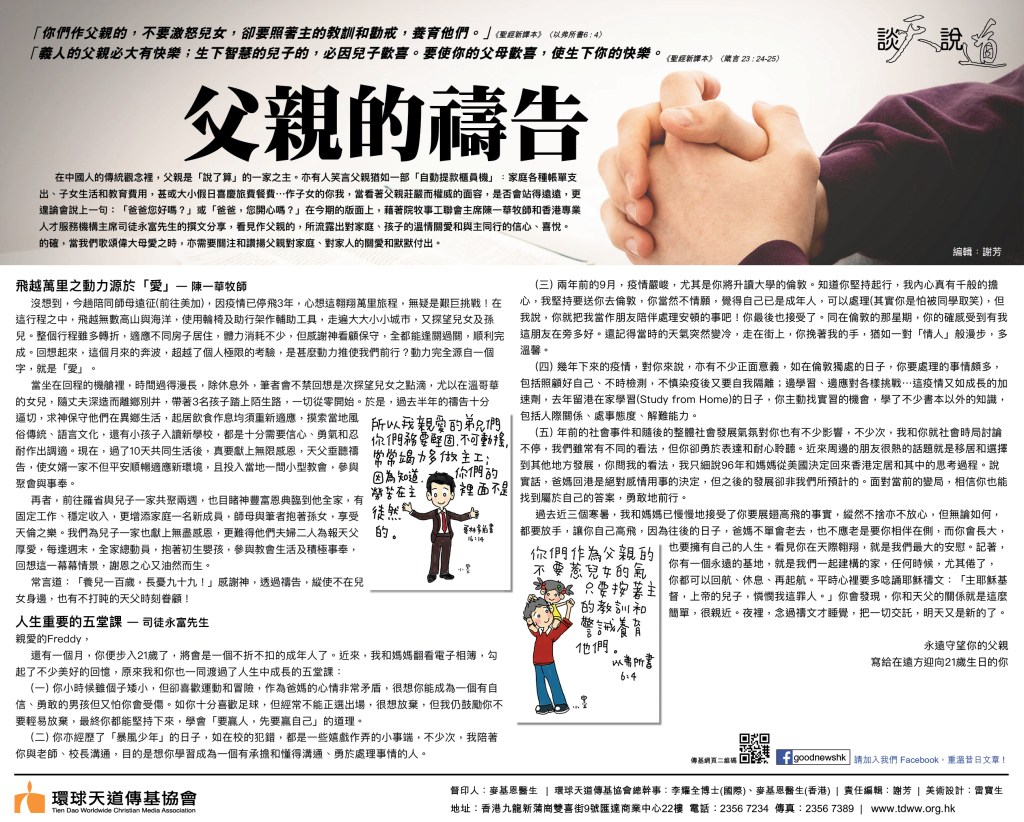 在中國人的傳統觀念裡,父親是「說了算」的一家之主。亦有人笑言父親猶如一部「自動提款櫃員機」﹕家庭各種帳單支出、子女生活和教育費用,甚或大小假日喜慶旅費餐費…作子女的你我,當看著父親莊嚴而權威的面容,是否會站得遠遠,更遑論會說上一句:「爸爸您好嗎?」或「爸爸,您開心嗎?」在今期的版面上,藉著院牧事工聯會主席陳一華牧師和香港專業人才服務機構主席司徒永富先生的撰文分享,看見作父親的,所流露出對家庭、孩子的溫情關愛和與主同行的信心、喜悅。