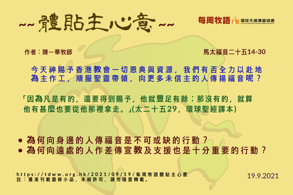 至於我們置身兩個不同的家庭,必然有責無旁貸的付出行動,就是盡本份關愛這兩個家庭裡的人,對他們的服侍不但沒有衝突,且是相得益彰,即只需要將家裡的人惦記心中,念念不忘,便不會厚此薄彼,樂意將時間、愛心及資源分配在兩個家庭上,作悉心安排,便收皆大歡喜之成效。