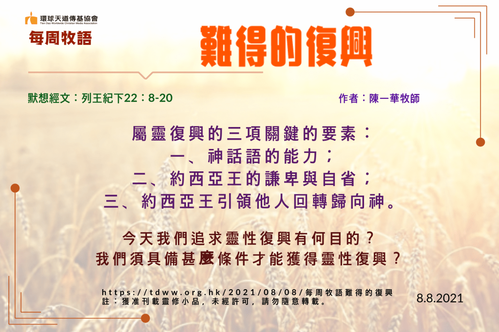 總結是次屬靈的復興,不難看見三項關鍵的要素:一、神話語的能力;二、約西亞王的謙卑與自省;三、約西亞王引領他人回轉歸向神。巴不得求神帶領我們面對時代挑戰時,賜給更大的復興,學效約西亞美好的榜樣,努力讀經、禱告、親近神。願那復興的靈火,先從我們個人身上燃起。