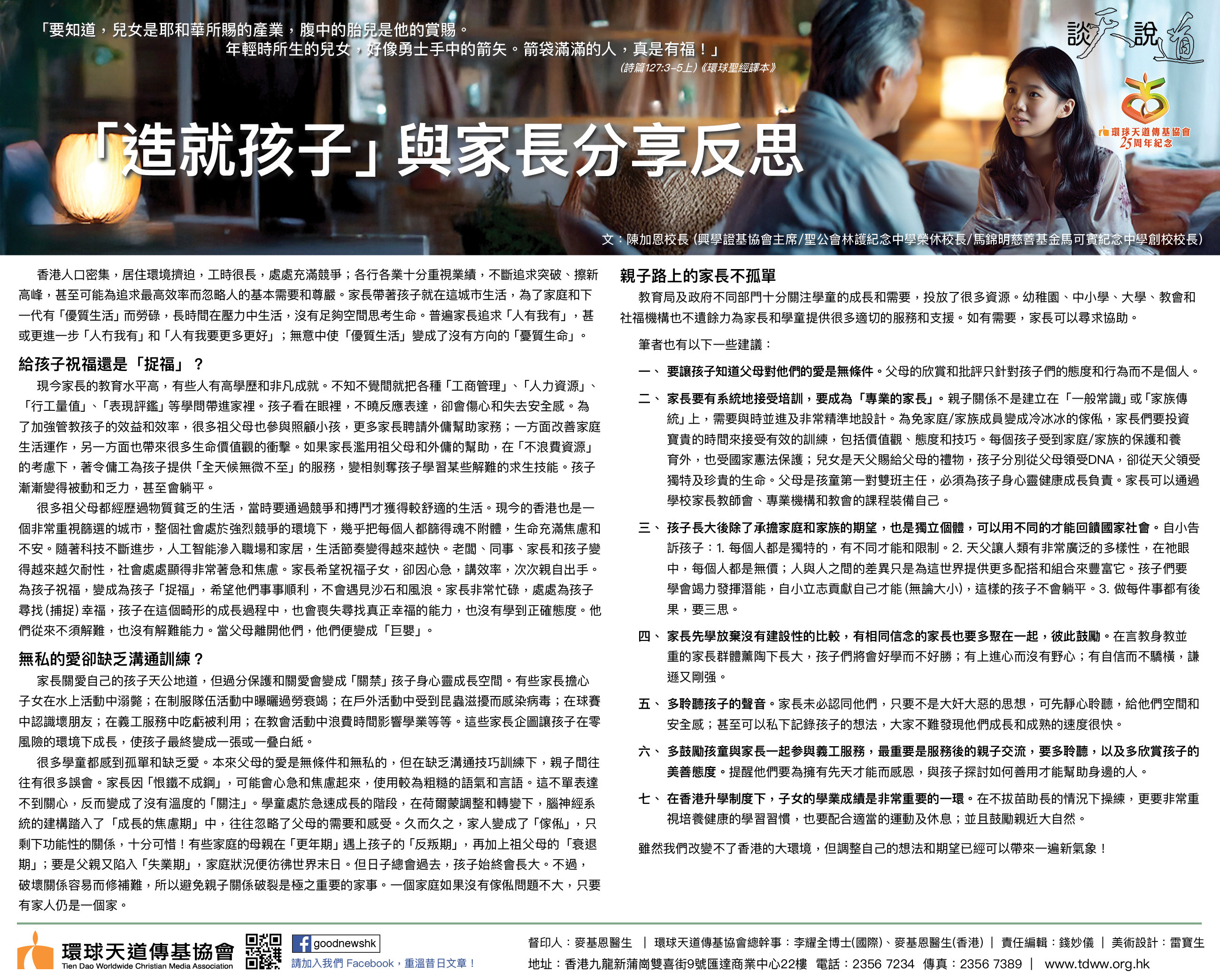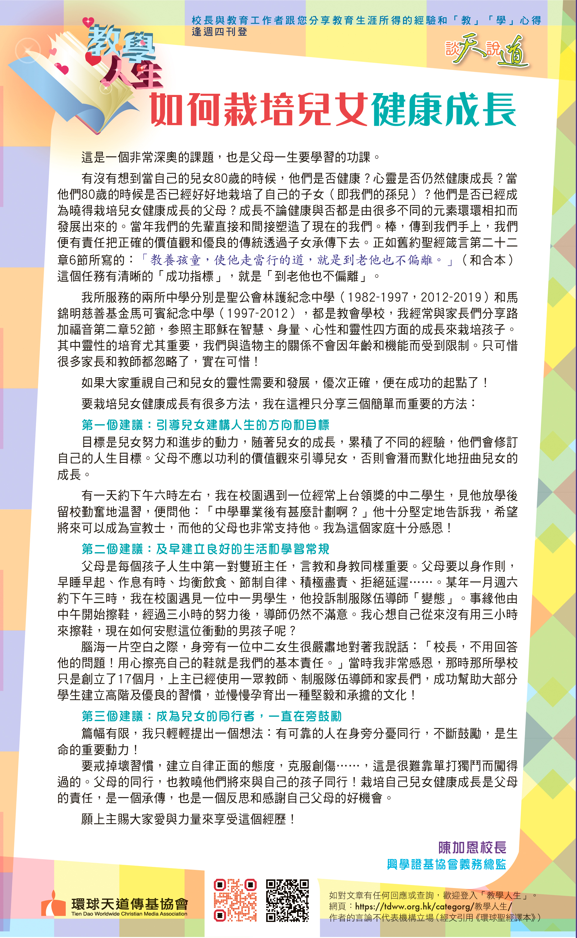 二、家長要有系統地接受培訓,要成為「專業的家長」。親子關係不是建立在「一般常識」或「家族傳統」上,需要與時並進及非常精準地設計。為免家庭/家族成員變成冷冰冰的傢俬,家長們要投資寶貴的時間來接受有效的訓練,包括價值觀、態度和技巧。每個孩子受到家庭/家族的保護和養育外,也受國家憲法保護;兒女是天父賜給父母的禮物,孩子分別從父母領受DNA,卻從天父領受獨特及珍貴的生命。父母是孩童第一對雙班主任,必須為孩子身心靈健康成長負責。家長可以通過學校家長教師會、專業機構和教會的課程裝備自己。
